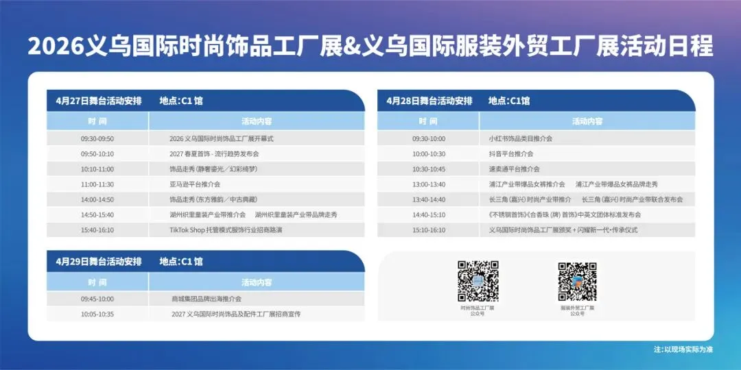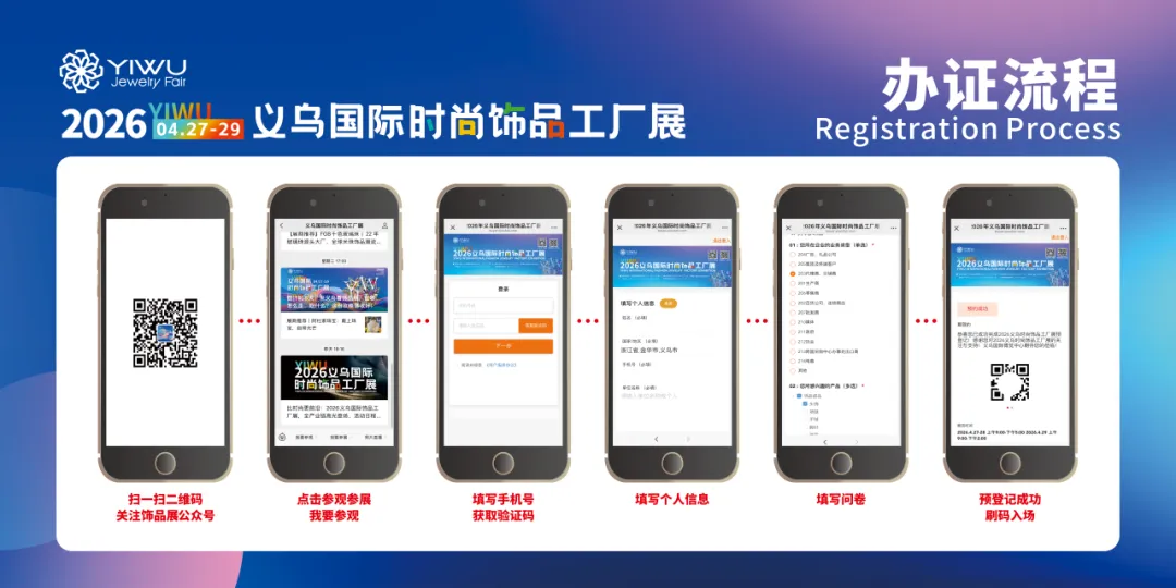 目前,观众预登记通道全面开启,海内外采购商可通过展会官方平台免费预约参观,锁定优质采购资源。4 月 27 日 - 29 日,诚邀全球业界同仁齐聚义乌,共赏饰界璀璨,共探产业新机!