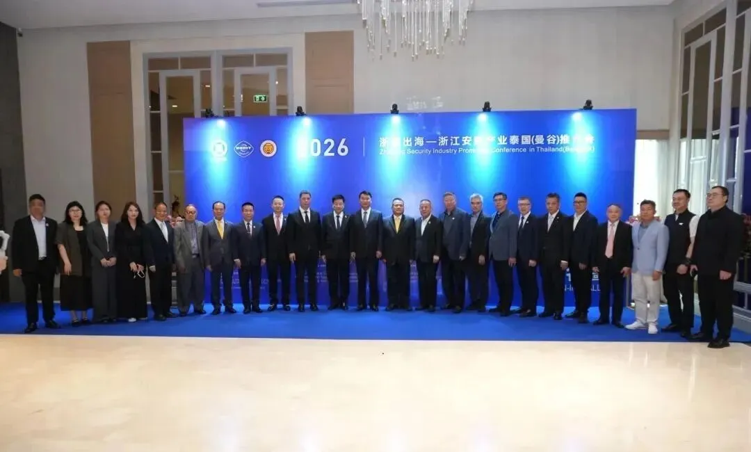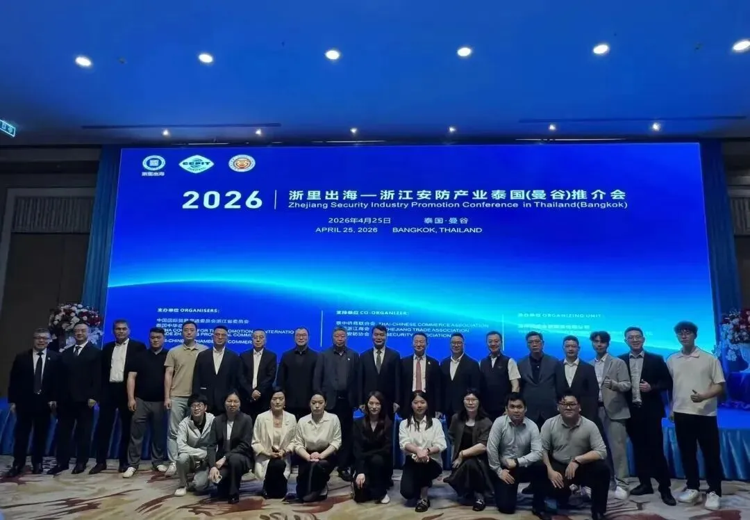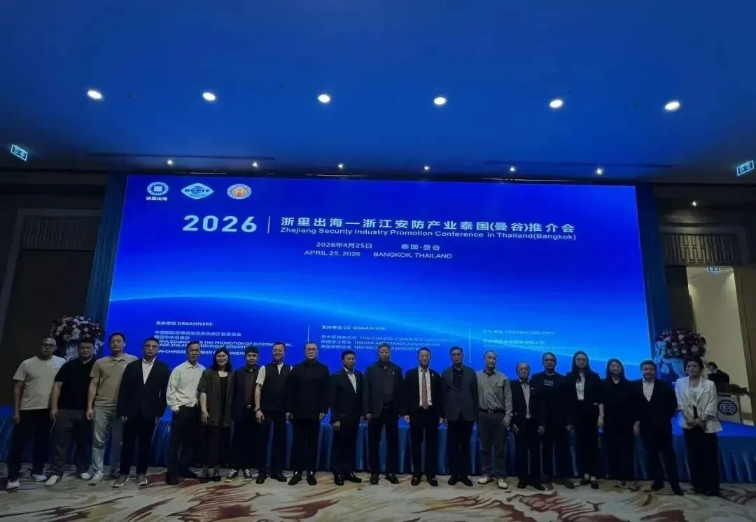 2026年4月25日下午,“2026浙里出海——浙江安防产业泰国(曼谷)推介会”在泰国中华总商会大厦九楼光华堂隆重举行。本次活动由中国国际贸易促进委员会浙江省委员会(CCPIT Zhejiang)与泰国中华总商会联合主办,泰国浙江商会、泰国安防协会协办,温州博观会展服务有限公司承办。来自中泰两国的政府代表、行业协会领导、企业家及行业专家共聚一堂,围绕安防产业的技术合作、市场拓展与本地化发展展开深入交流。