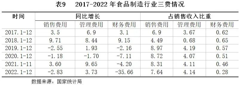 2022年,食品制造行业销售费用、管理费用和财务费用占销售收入的比重整体与2021年相比继续提升,说明2022年食品制造行业的费用控制成本有所增加。