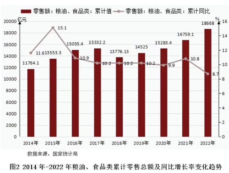 2022年,市场规模接近上年水平。2022年,社会消费品零售总额439733亿元,比上年下降0.2%。必需类商品销售较好。2022年,商品零售额比上年增长0.5%,限额以上单位十八类商品类值中近五成商品类值零售实现正增长。吃类商品销售增长较快。2022年,限额以上单位粮油食品类值累计值18667.7亿元,累计增长8.7%,增速较2021年同期回落2.1个百分点。