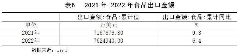 2022年,我国食品出口金额累计762.49亿美元,同比上涨6.4%,增速较上年同期收窄2.9个百分点。