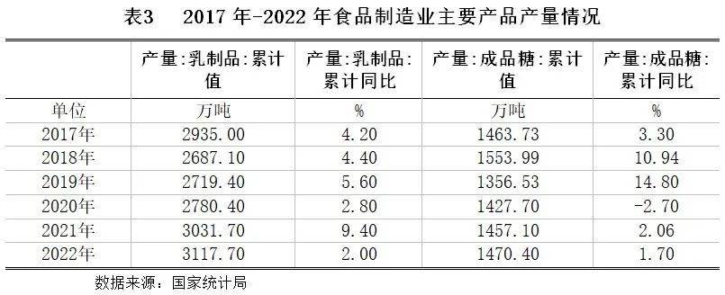 2022年以来,主要食品产量整体呈增长趋势,乳制品产量与成品糖产量基本与上年持平。2022年,乳制品产量为3117.7万吨,同比上涨2.0%,增速较上年同期有所放慢;成品糖产量累计1470.4万吨,同比上涨1.7%。