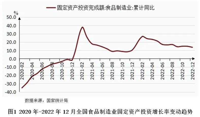 国家统计局发布的数据显示,2022年1-12月,食品制造行业固定资产投资额同比增长13.7%,增速较2021年同期提高3.3个百分点。2022年开年食品制造业投资增速处于高位,随后处于逐渐下降趋势,整体上全年均处于较高水平。