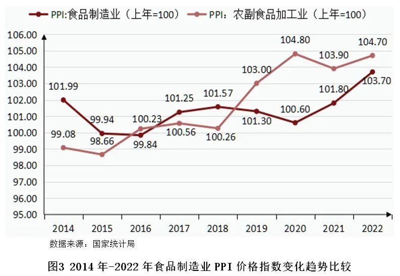 由于成本端原材料、包材、运费齐涨,产业链利润被挤压,2022年食品制造业出厂价格呈现上涨趋势。国家统计局数据显示,2022年食品制造业工业生产者出厂价格指数为103.7,农副食品制造业工业生产者出厂价格指数为104.7,表明食品价格较2021年同期略有增长。在“疫情”之下,食品作为刚需产品,需求下降不明显,价格并未受到较大影响。