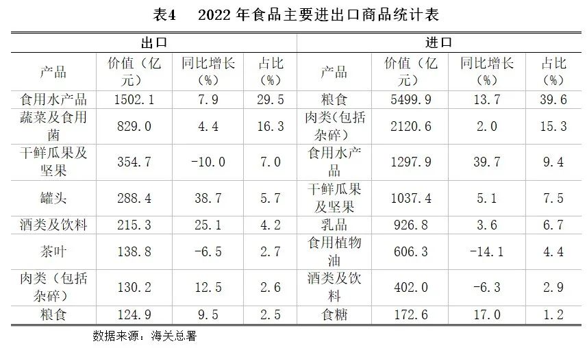 就进出口产品种类看,食用水产品、蔬菜及食用菌和干鲜瓜果及坚果为主要出口食品;粮食、肉类(包括杂碎)、食用水产品主要进口食品。