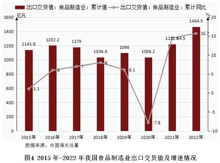 受到新冠肺炎疫情的影响,食品企业出口受到人工、材料、管理成本上升与国际运力下降的影响,增加了企业的履约成本,但同时疫情引起各国消费者购买方便食品的需求增长,也为企业带来了更为广阔的消费市场。2022年,新冠疫情在常态化防控下,海外需求回升,食品行业出口处于回暖态势。2022年1-12月,我国食品制造业出口交货值累计1464.5亿元,同比增长15.7%。