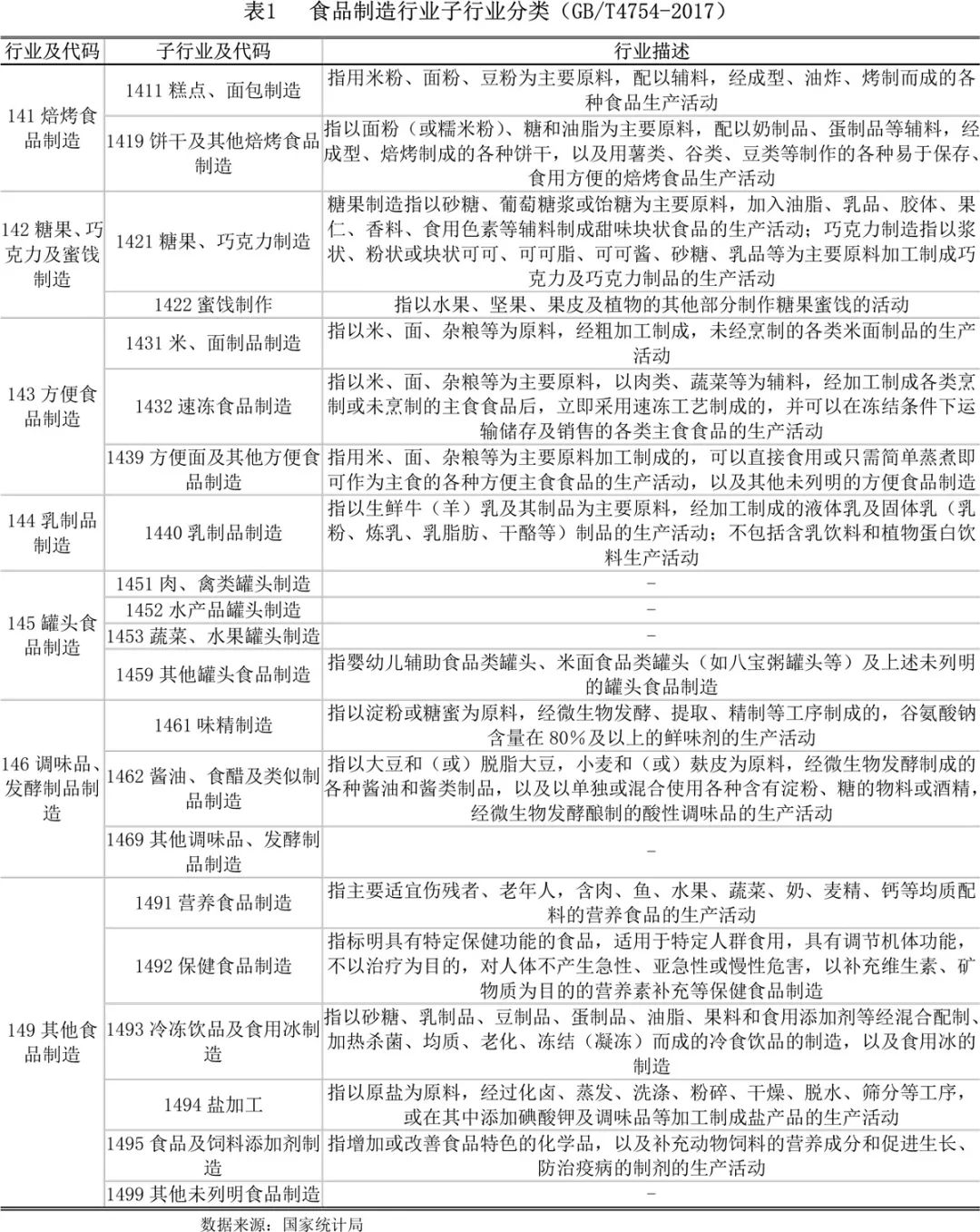 根据国家统计局制定的《国民经济行业分类与代码(GB/T 4754-2017)》,食品制造隶属于制造业(C14),包括焙烤食品制造(141)、糖果、巧克力及蜜饯制造(142)、方便食品制造(143)、乳制品制造(144)、罐头食品制造(145)、调味品、发酵制品制造(146)及其他食品制造(149)7个子行业。