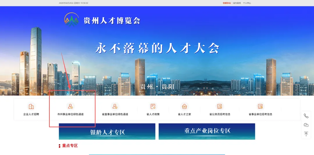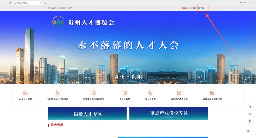 打开「贵州人才博览会」官网(https://rc.guizhou.gov.cn),点击右上角用户登录;新用户先完成注册,再登录个人中心。