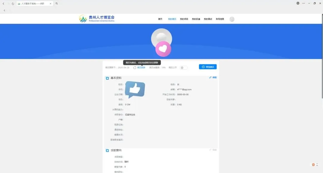 登录后自动跳转简历页,所有带*项务必填完:学历、专业、资格证、工作经历、获奖情况等,信息越完整,匹配度越高,HR更青睐!