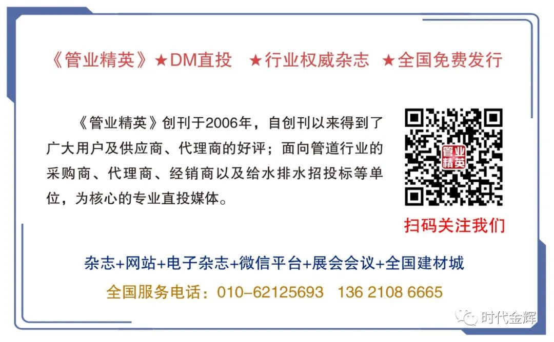 《管业精英》全方位报道国内外管道、管材、管件及周边配套设备的新技术、新产品,本刊以“服务”为宗旨,以“促进产品推广与交流”为已任,并竭力将此刊发展成为广大业内外采购、专业人士人手必备的具有较强的参考价值、实用性及权威性的商业书刊。