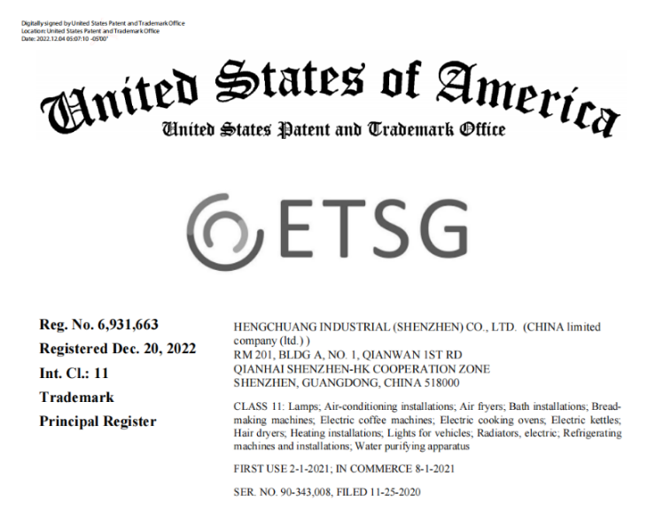 工业品品牌ETSG,在美国注册成功