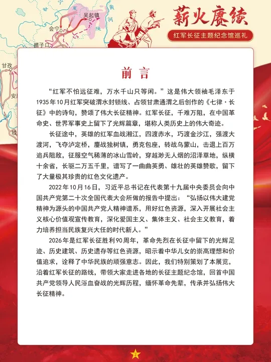 “红军不怕远征难,万水千山只等闲。”长征,是中国工农红军在中国共产党的领导下,以不畏艰险、前仆后继的英雄气概谱写的团结战斗的光辉史诗,是中国革命史上的奇迹。英雄的红军在长征途中血战湘江,四渡赤水,巧渡金沙江,强渡大渡河,飞夺泸定桥,征服空气稀薄的冰山雪岭,穿越渺无人烟的沼泽草地,纵横十余省,长驱二万五千里,谱写了一曲曲英勇、雄壮的英雄赞歌,留下了大量极其珍贵的红色文化遗产。革命先烈在长征中留下的光辉足迹、历史建筑、历史遗存等红色资源,昭示着中华儿女的崇高理想和价值追求,诠释了中华民族的顽强意志。本展览将沿着红军长征的路线,带领大家走进各地的长征主题纪念馆,回首中国共产党领导人民浴血奋战的光辉历程,缅怀革命先辈,传承并弘扬伟大长征精神。