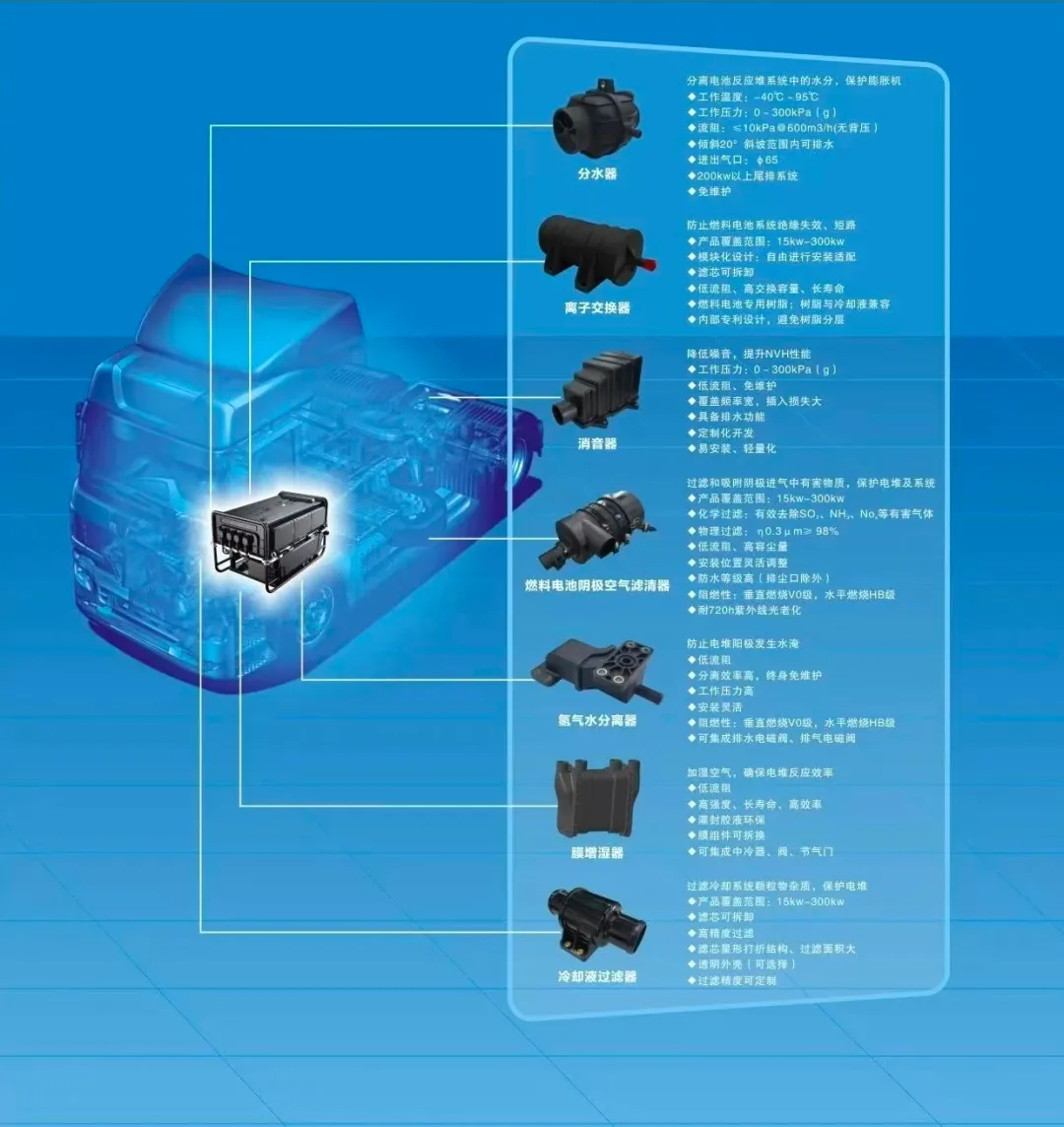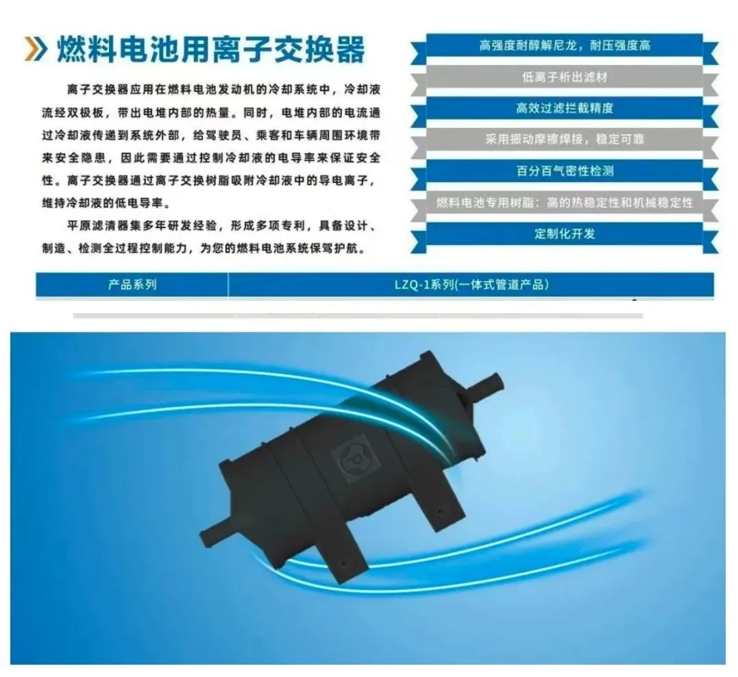 在化学空滤方面,展出了专为200-300kW大功率燃料电池系统打造,在氨气(NH₃)等吸附能力上较竞品提升一倍以上,大幅延长电堆寿命;在热管理系统离子控制方面,相关系列离子交换器通过优化自主配比的混床树脂,使用寿命可达3万公里或9个月,较上一代产品提升50%以上。