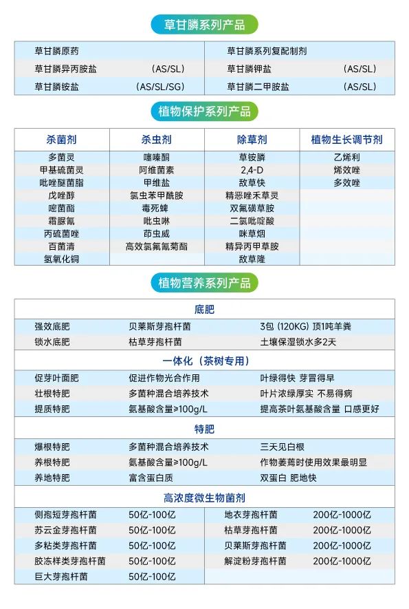 苏农科技坚持生态环境友好导向和生物技术引领,致力于对植物保护产品和植物营养产品的创新研发和高端制造。公司在中国广德、菲律宾达沃、孟加拉达卡的三个生产基地拥有年产100,000吨的多条国际化的先进生产系统,草甘膦系列、微生物菌肥系列等为公司主导产品。