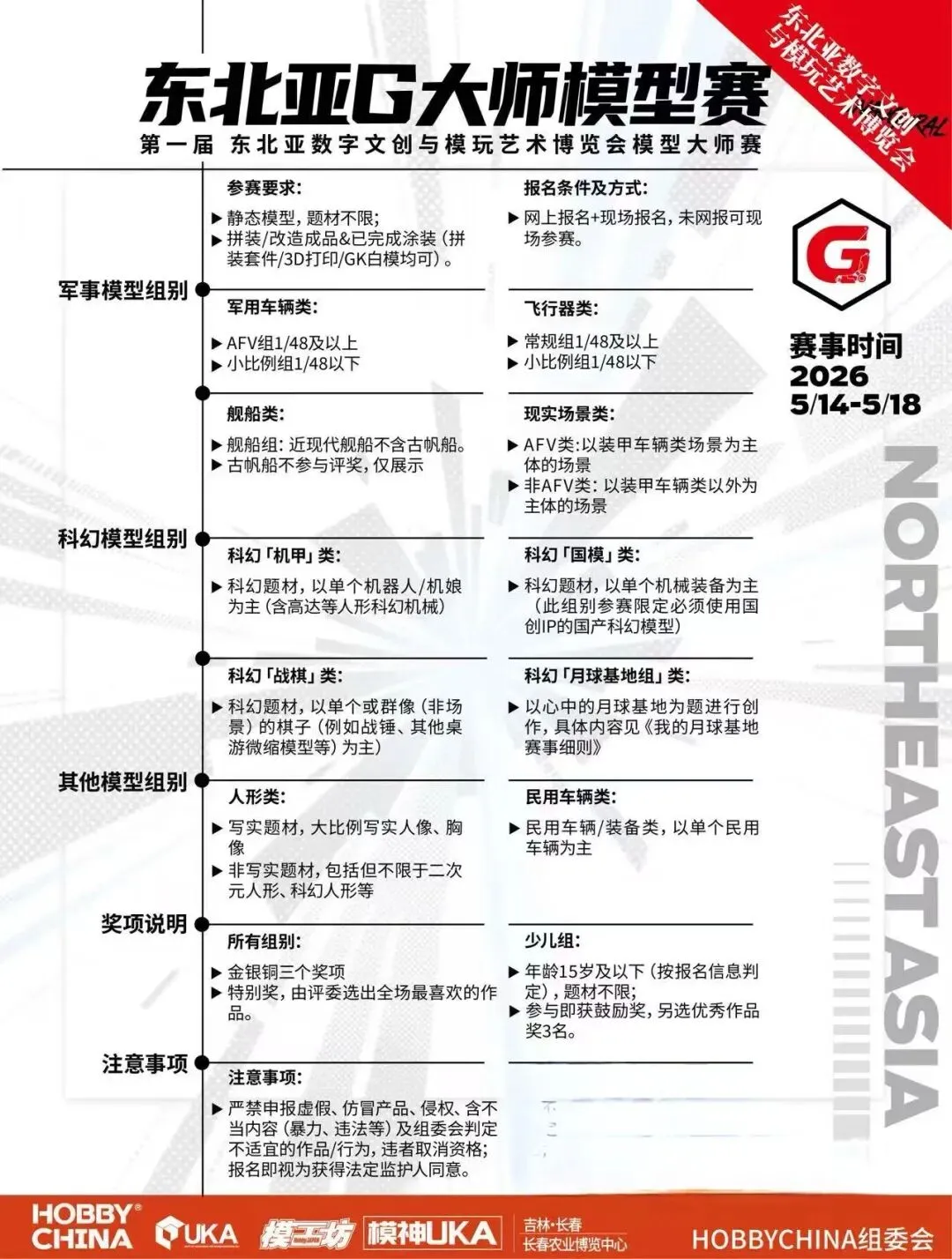 - 东北亚G大师模型赛:军事/科幻/人形/民用车辆/少儿组全品类开放,金银铜奖+特别奖等你来拿