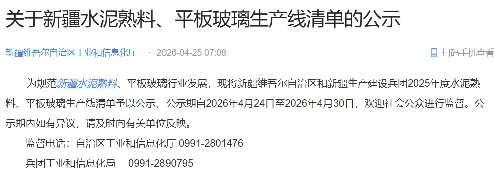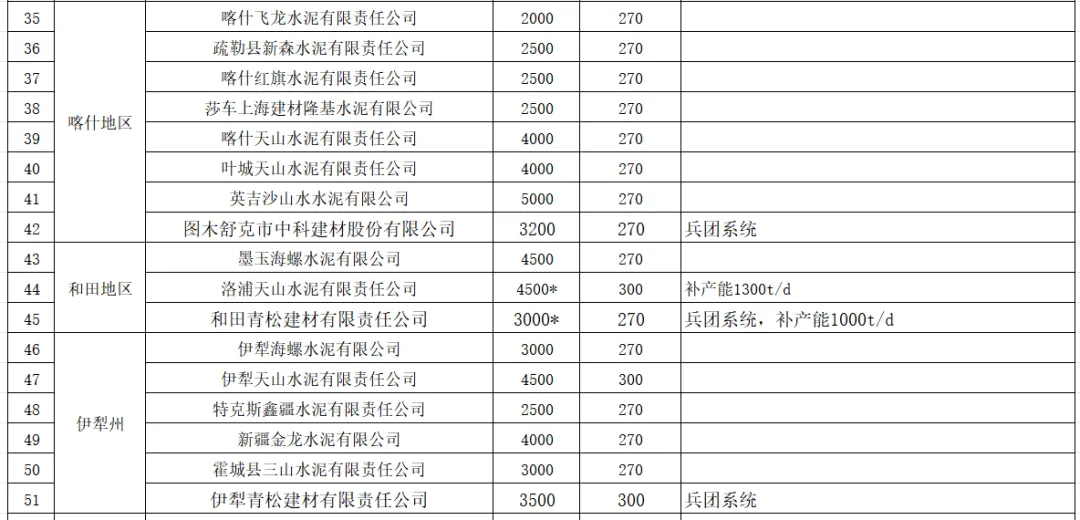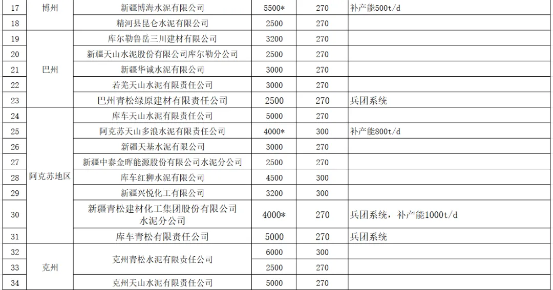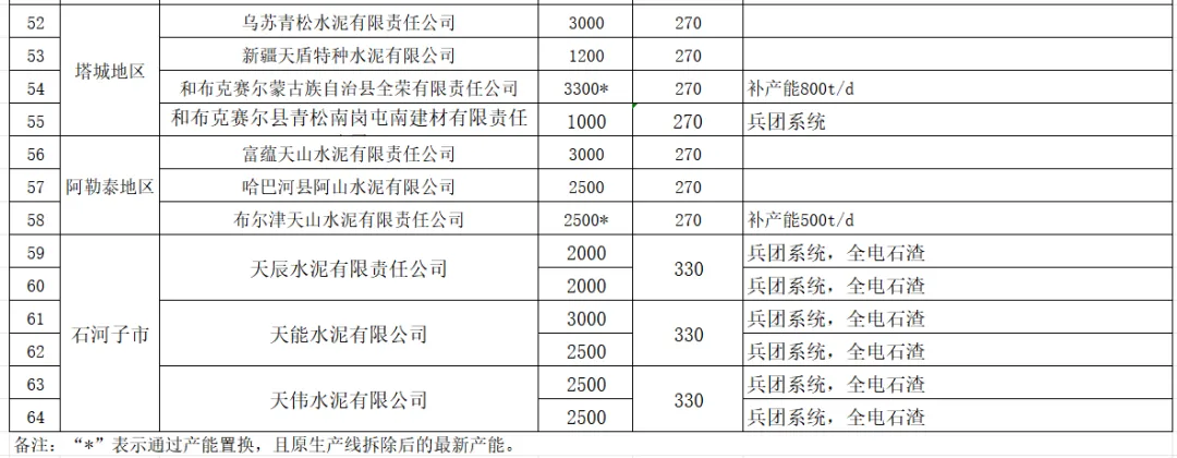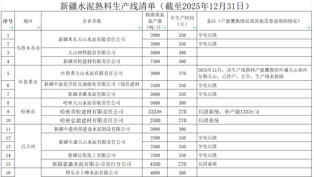 26年4月24日新疆维吾尔自治区工业和信息化厅发布了《关于新疆水泥熟料、平板玻璃生产线清单的公示》根据公示清单,截止到25年底,新疆共计有水泥熟料生产线64条,其中有一条已经置换停产,尚未拆除,其中电石渣线13条,年生产天数均为330天,其中有12条熟料线年运行天数300天,其中39条熟料线年运行天数270天,其中有8条熟料线已公告补产能,其中16条熟料线属于兵团系统。具体数据如下表。这是目前公开查询到的第五个省级工信部门公布的2025年度水泥熟料生产线清单,其他分别为重庆,四川,河北、宁夏。