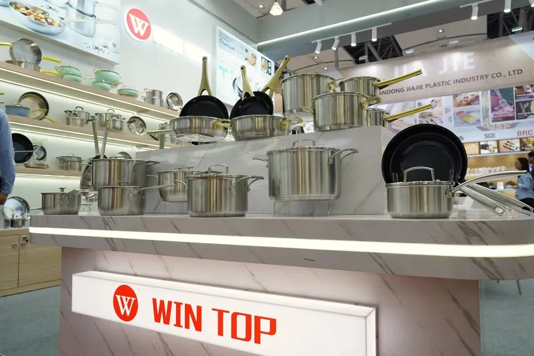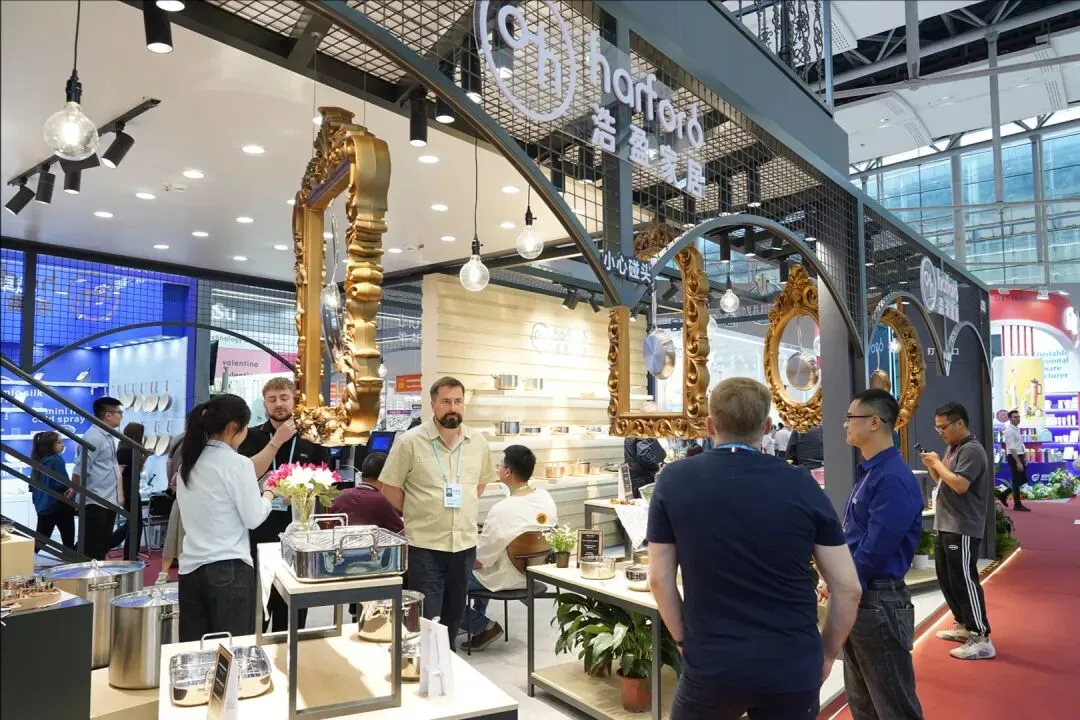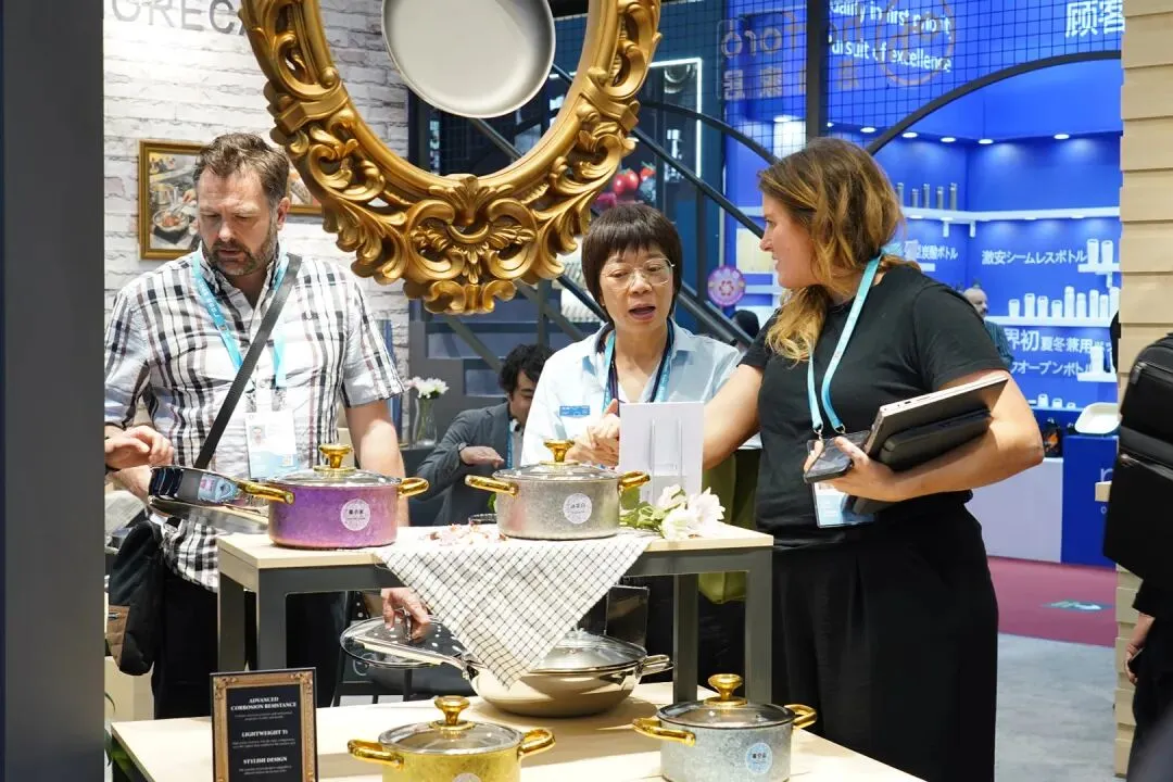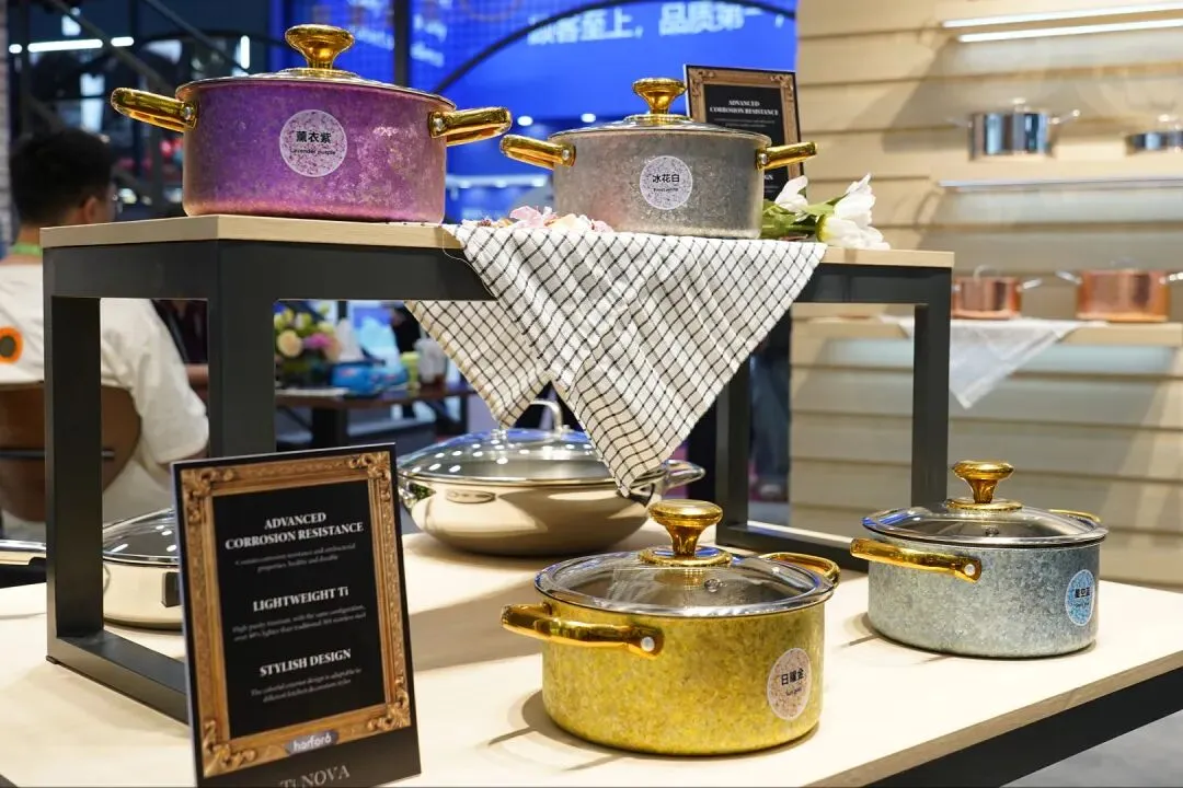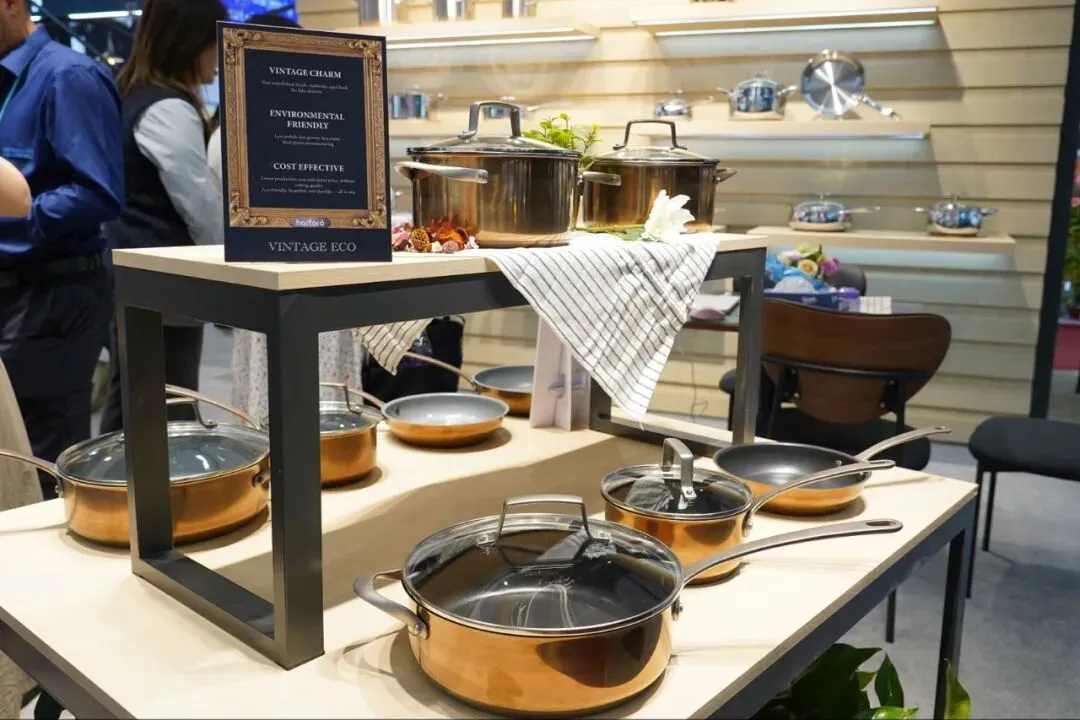 本届广交会,浩盈家居集中推出欧式复古、冰雕花、等离子、抗黄变等六大系列共约80款不锈钢厨具产品,多款新品在展会首次亮相。其中复古系列产品亮点十足,凭借差异化工艺与绿色理念脱颖而出。产品保留不锈钢明火灼烧后自然形成的渐变色彩,摒弃多余表面加工工艺,既有效压缩生产成本、减少化工用料,又降低能源消耗,契合绿色低碳发展趋势;同时,浩盈家居创新推出冰花工艺锅具,借鉴潮流日用品流行饰面技术,打造多种色彩,颜值出众、辨识度高;钛材质品类更是具备强耐腐蚀、超轻量化优势,适配多元化居家使用场景。