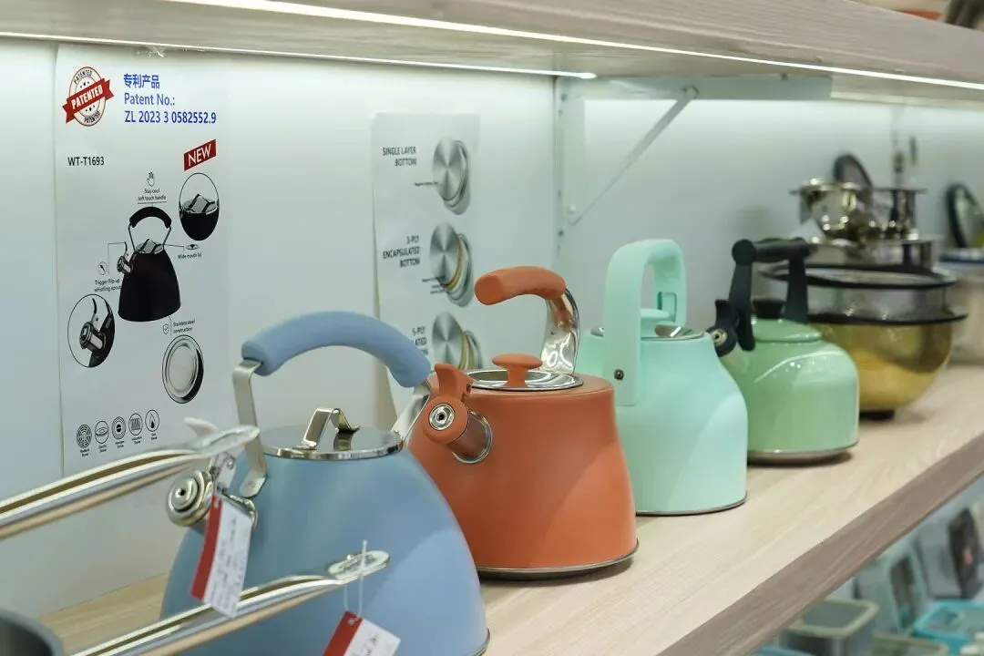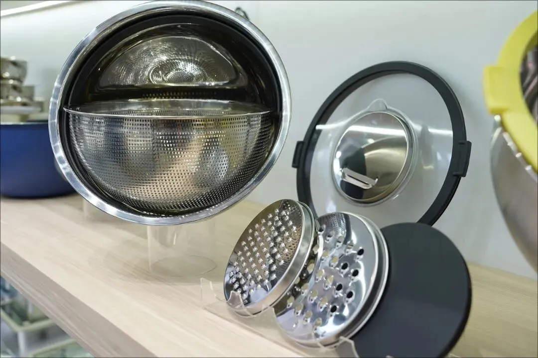 本届展会中,盈拓家居携三大系列80余款产品亮相,其中三分之一为首次发布的新品,涵盖高端不锈钢炊具、响水壶、多功能沙拉碗等,凭借时尚设计与实用功能,深受广大客商青睐,成为企业吸引订单的“利器”。“这款多功能打蛋盆套装,兼具打蛋、洗水果、滤面条三重功能,客户花一份钱享三重价值,性价比远超同类产品。”盈拓家居总经理容同强介绍,该新品首次亮相便斩获多个来自德国、美国的意向订单。