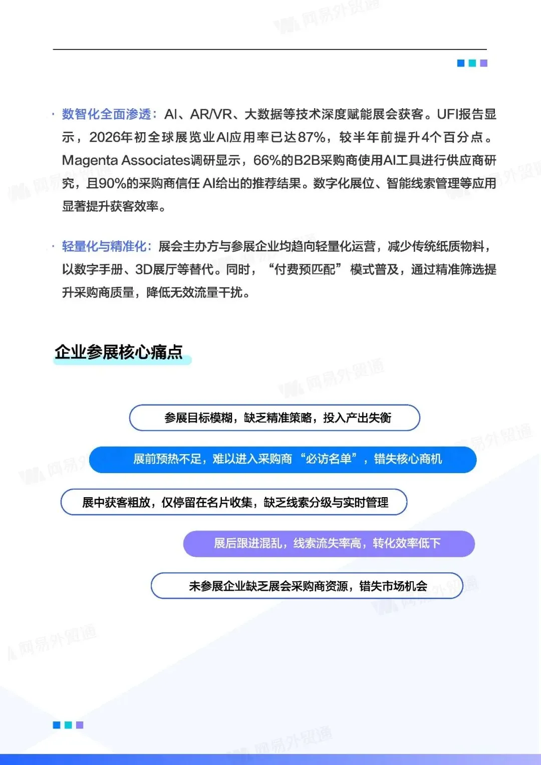 参展核心痛点:包括目标模糊、预热不足、获客粗放、跟进混乱及未参展企业缺资源等。