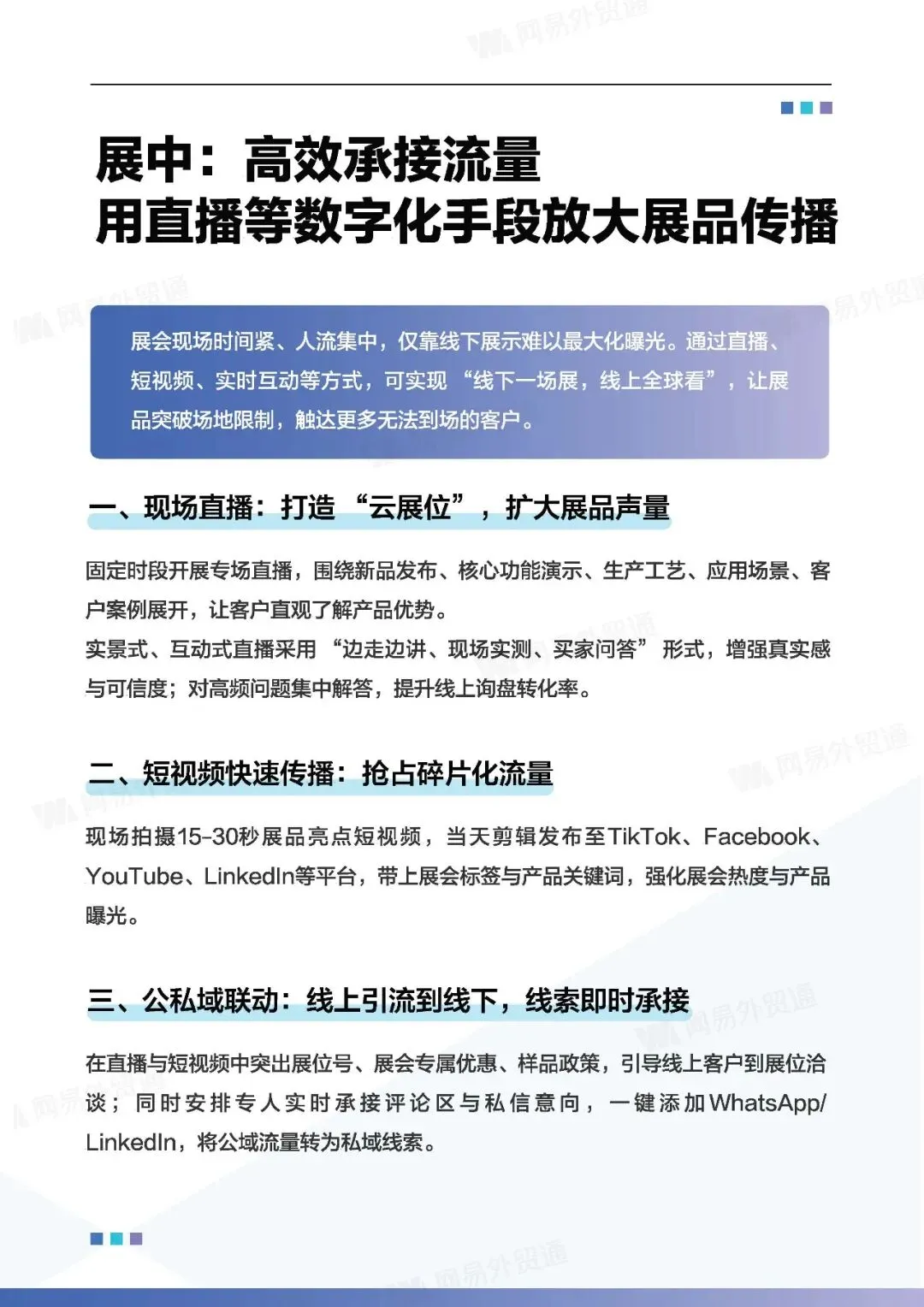 展中:高效沟通,展现专业力,利用直播、短视频扩大传播,实时管理线索。