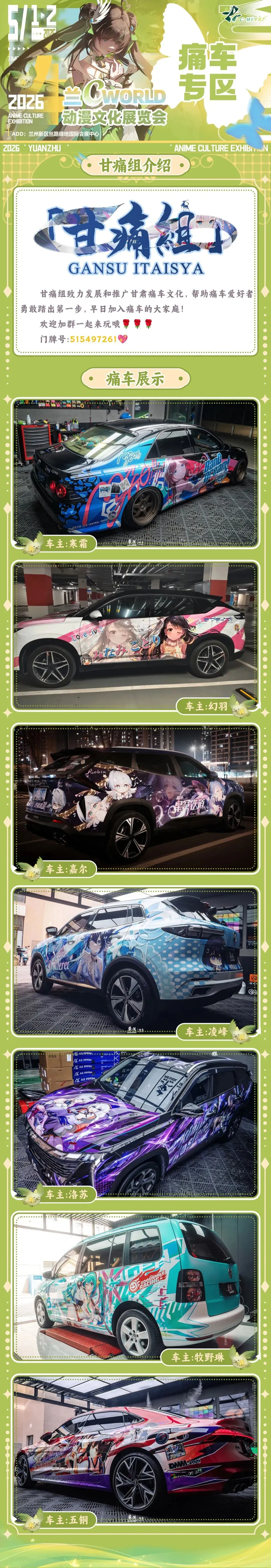 甘肃本土痛车社团集结,多台高颜值定制痛车现场展出,特色涂装超好出片,痛车爱好者线下交流打卡必逛。