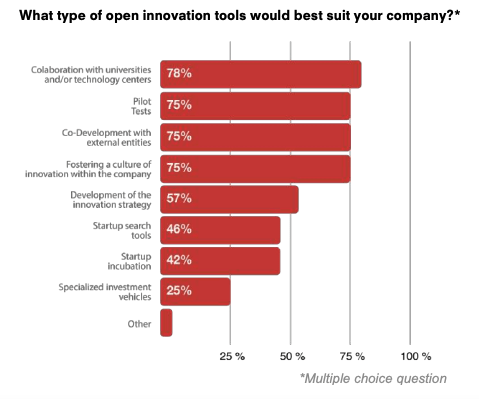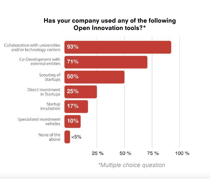 该报告对来自欧洲和美洲的43家公司进行了调查,其中86%的公司表示他们愿意在2023年加大对开放式创新的投资,而有93%的公司计划在未来3年内进行投资。对于初创企业:超过90%的公司表示他们与大学和研究中心合作,而只有50%的公司选择与初创企业合作。此外,仅有25%的公司直接对初创企业进行投资,17%的公司则孵化了初创企业。