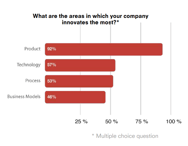 4)企业的创新主要集中在产品开发而非过程和商业模型,而商业模式在创新领域中受到的关注最少。