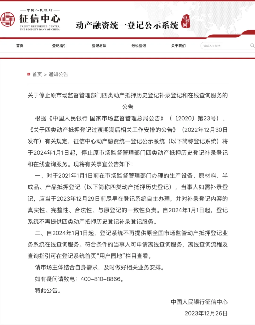 2023年底,征信中心发布公告明确:自2024年1月1日起,两类“老”登记均需向征信中心申请查询。至此,征信中心已全部承接市场监管部门移交的历史数据。