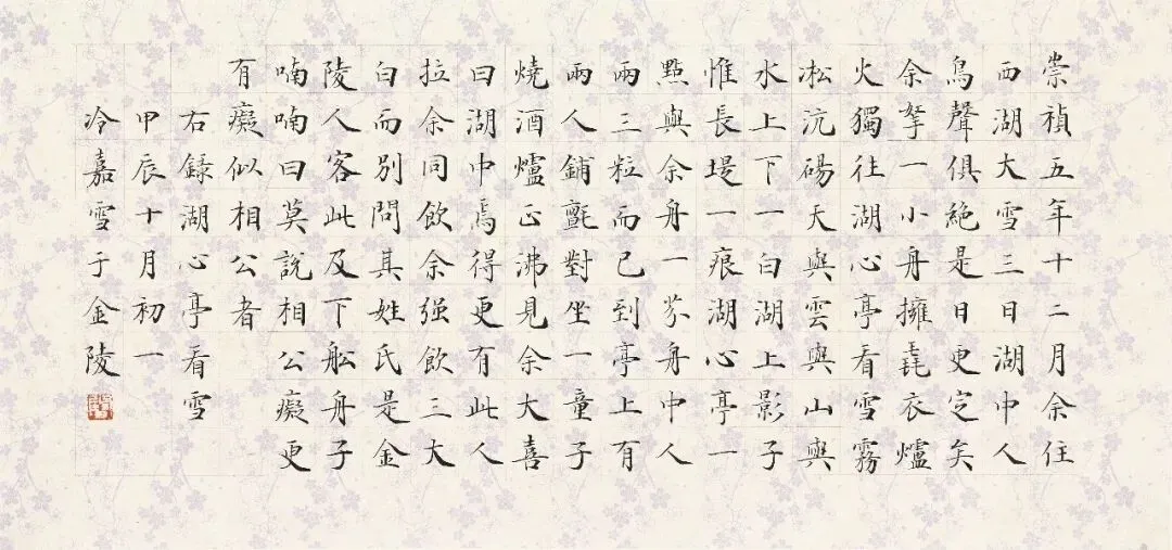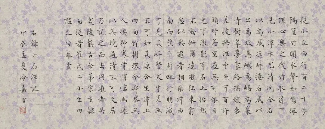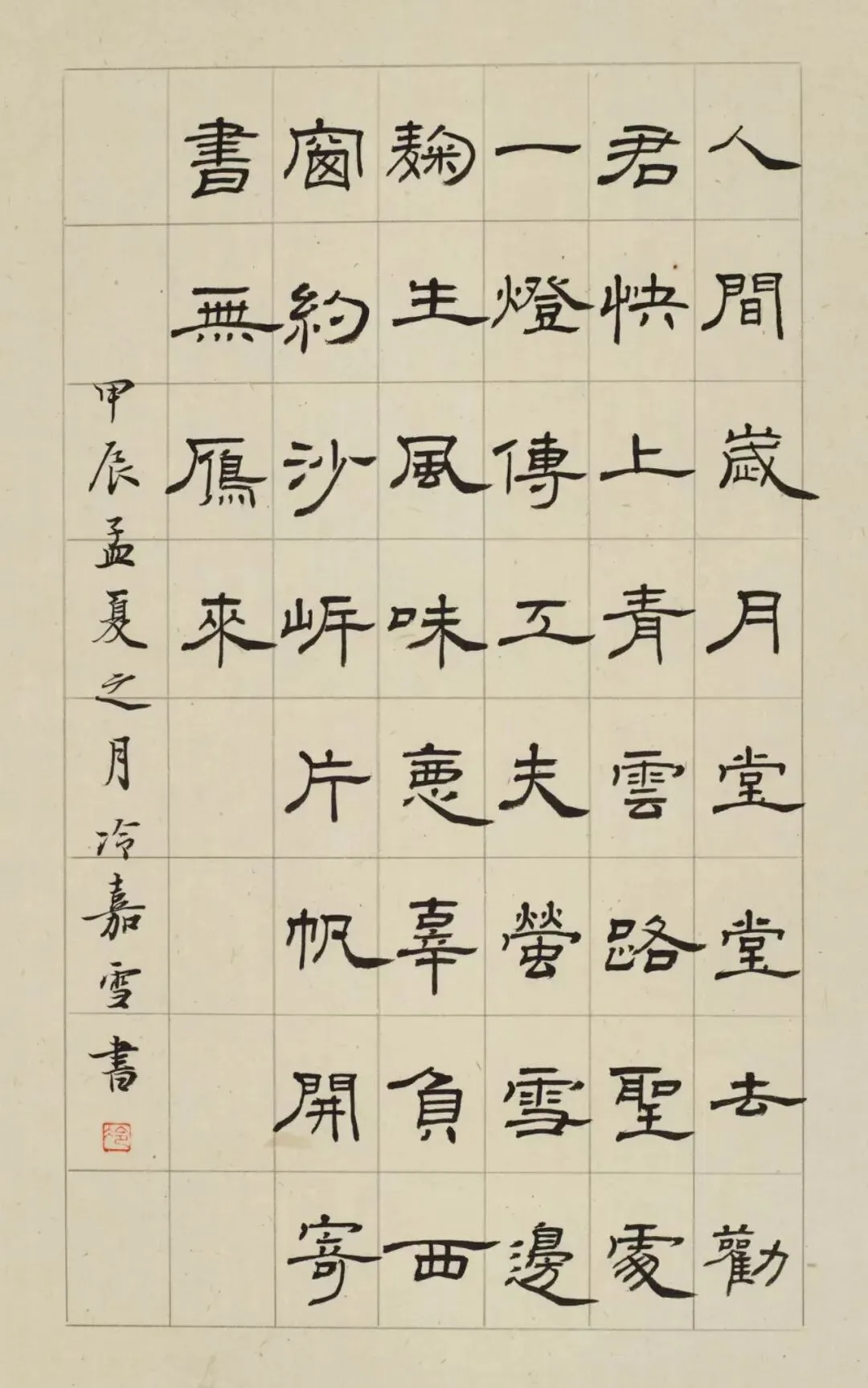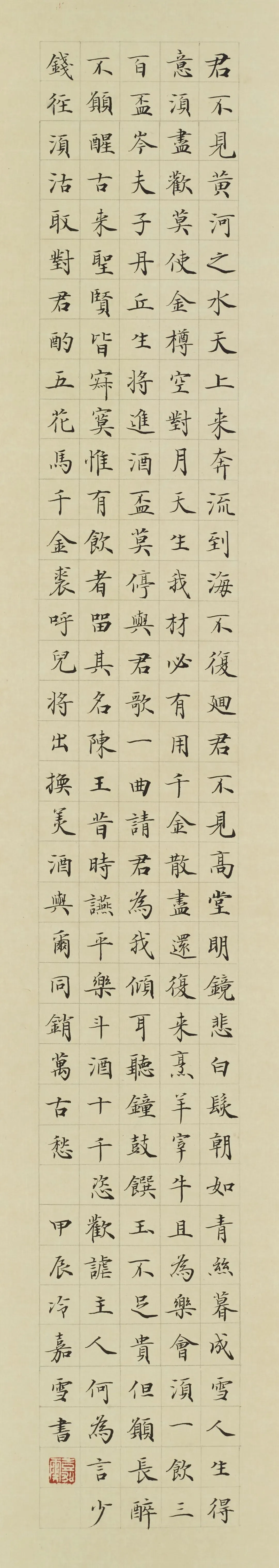 冷嘉雪习真、草、篆、隶诸体而兼擅,尤以楷书见长。她深入「二王」正统,却并不止步于帖学的摹习,而是进一步探入宋代书法所蕴含的文人精神与意象结构。在她的笔下,笔画不仅是技法的呈现,更像是一种气息的流动:起笔含蓄,行笔内敛,收笔悠远,字里行间透出东方审美特有的节制与静谧。这种气质,使她的书法既有古典法度的庄严,又带有当代审美的清朗。