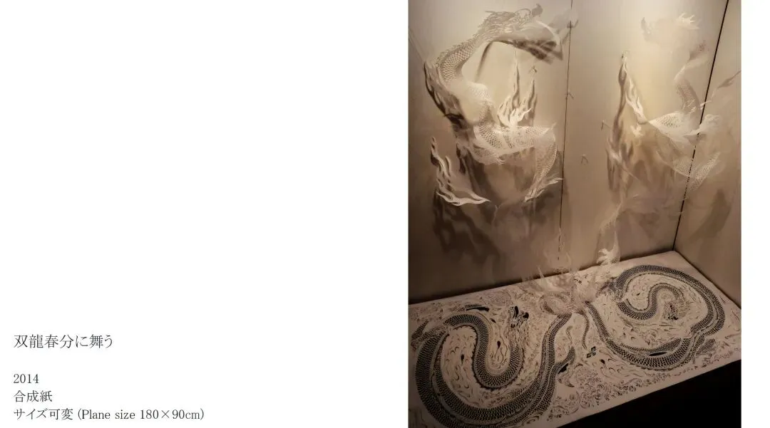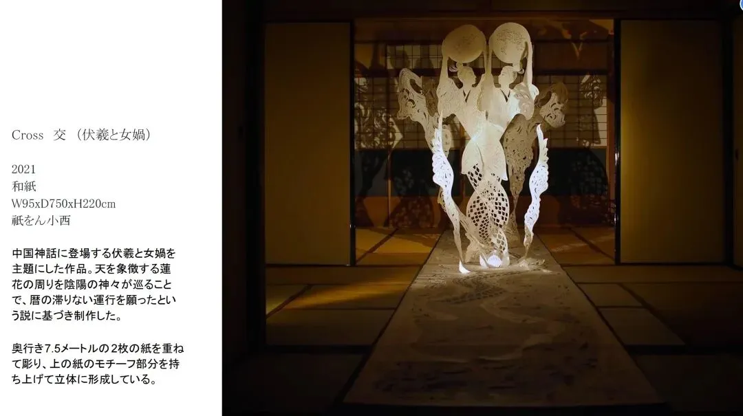 望月惠利用在一张纸上雕刻而成的剪纸所特有的张力和透明美感,在寺庙,茶室等传统建筑中创作了许多大型装置作品。近年来,他的作品主题涵盖中国神话和古代思想。她从历史遗产中汲取教训,重现人类的普遍精神。此外,由于对材料的兴趣,她持续续关注各国的造纸业。