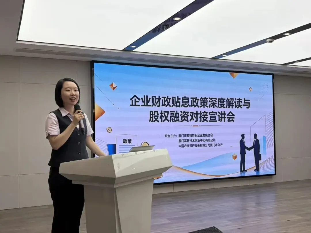 4月24日下午,由厦门市专精特新企业发展协会主办,厦门高新技术创业中心有限公司支持,中国农业银行厦门市分行协办的“企业财政贴息政策深度解读与股权融资对接”主题宣讲会在火炬新科广场成功举行。本次活动旨在帮助企业精准把握当前财政贴息政策红利,拓宽股权融资渠道,助力专精特新及科创企业高质量发展。众多专精特新企业代表、金融机构专家及行业嘉宾齐聚一堂,围绕“政策解读+资本对接”展开深度交流。