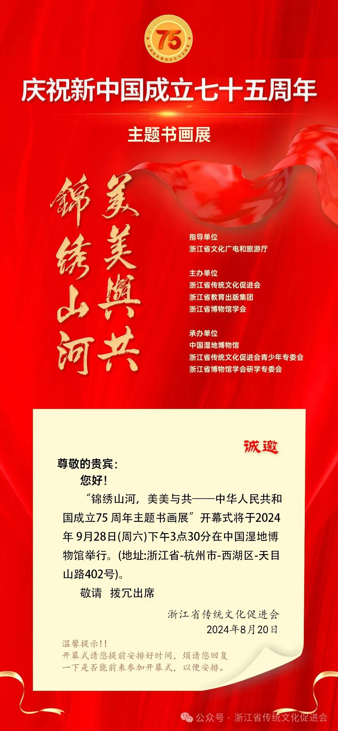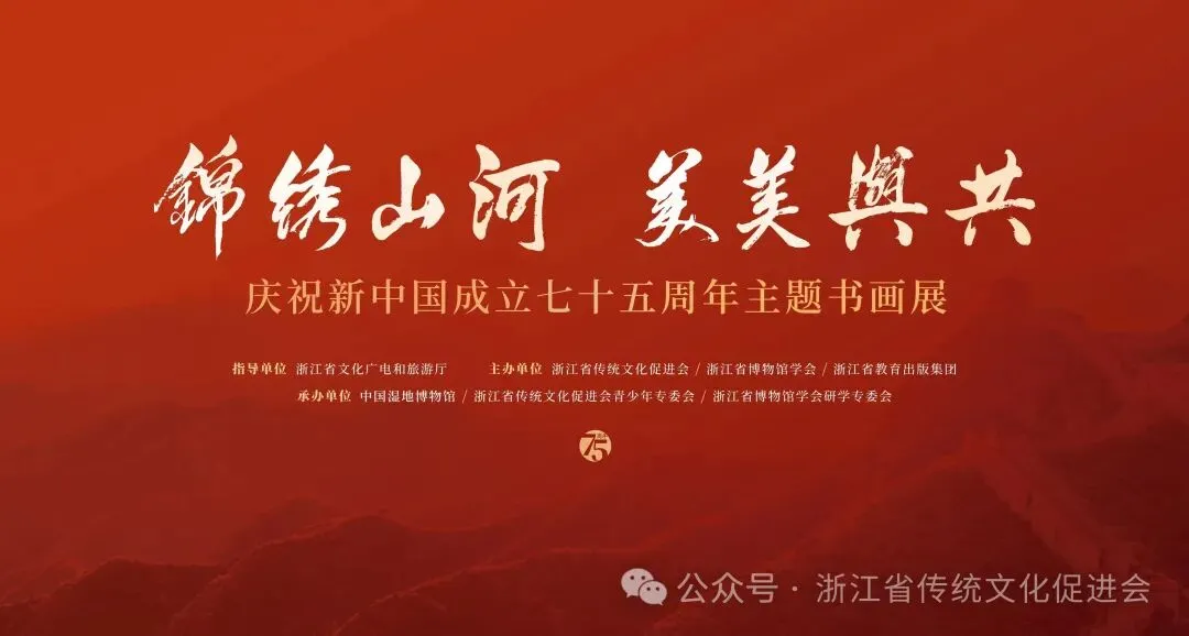 为庆祝新中国成立75周年,习总书记提出“弘扬中华优秀传统文化”号召十周年,在浙江省文化广电和旅游厅指导下,浙江省传统文化促进会、浙江省教育出版集团、浙江省博物馆学会联合主办,浙江省传统文化促进会青少年教育培训专委会、浙江省博物馆学会研学专委会、中国湿地博物馆等单位共同承办 “锦绣山河美美与共”主题书画展,着眼新时代艺术高度,以国韵写精神,以盛世绘华章,共同颂扬祖国的繁荣与伟大,献礼祖国母亲七十五岁华诞!