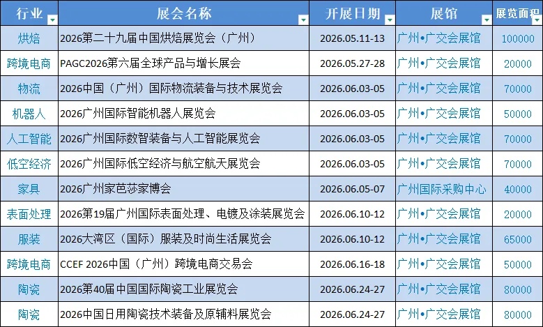 2026年5月-6月广州这10+专业展会,覆盖烘焙、家具、物流、跨境电商、AI机器人、服装等多个领域,不管你是从业者、创业者,还是单纯想逛展打卡,总有一场适合你,记得收藏,后续持续更新具体逛展指南