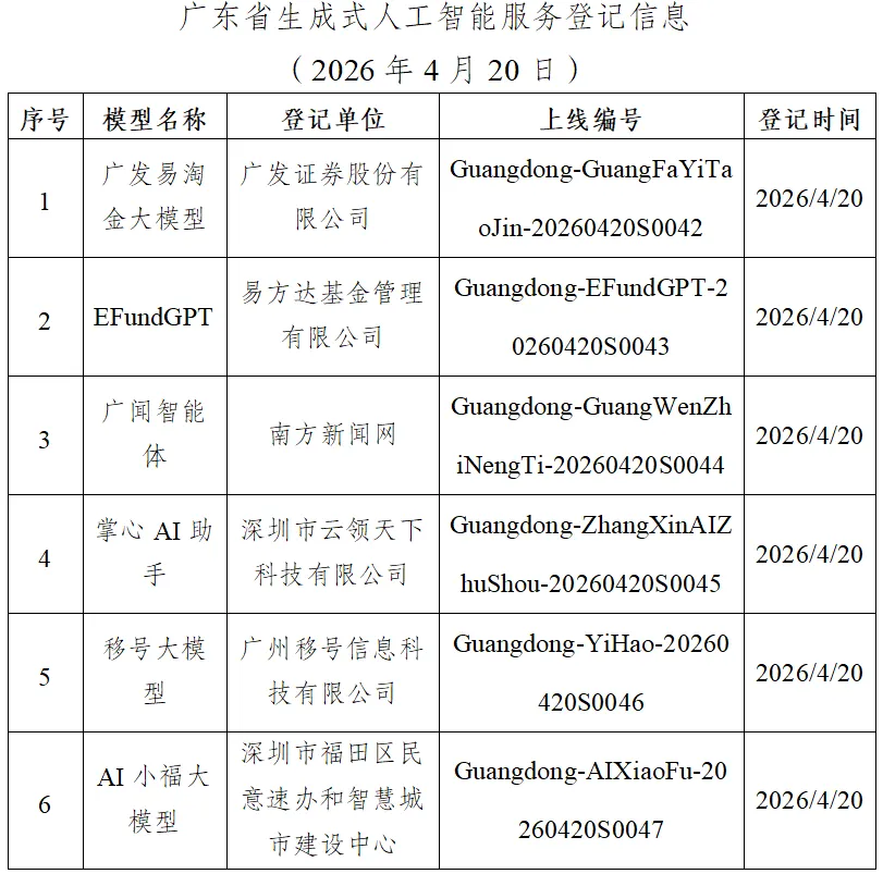 ■ 4月20日,广东省互联网信息办公室发布《广东省生成式人工智能服务登记信息公告(4月20日)》。据公告,截至4月20日,我省新增6款已完成登记的生成式人工智能服务,累计已完成47款生成式人工智能服务登记。了解更多>>>