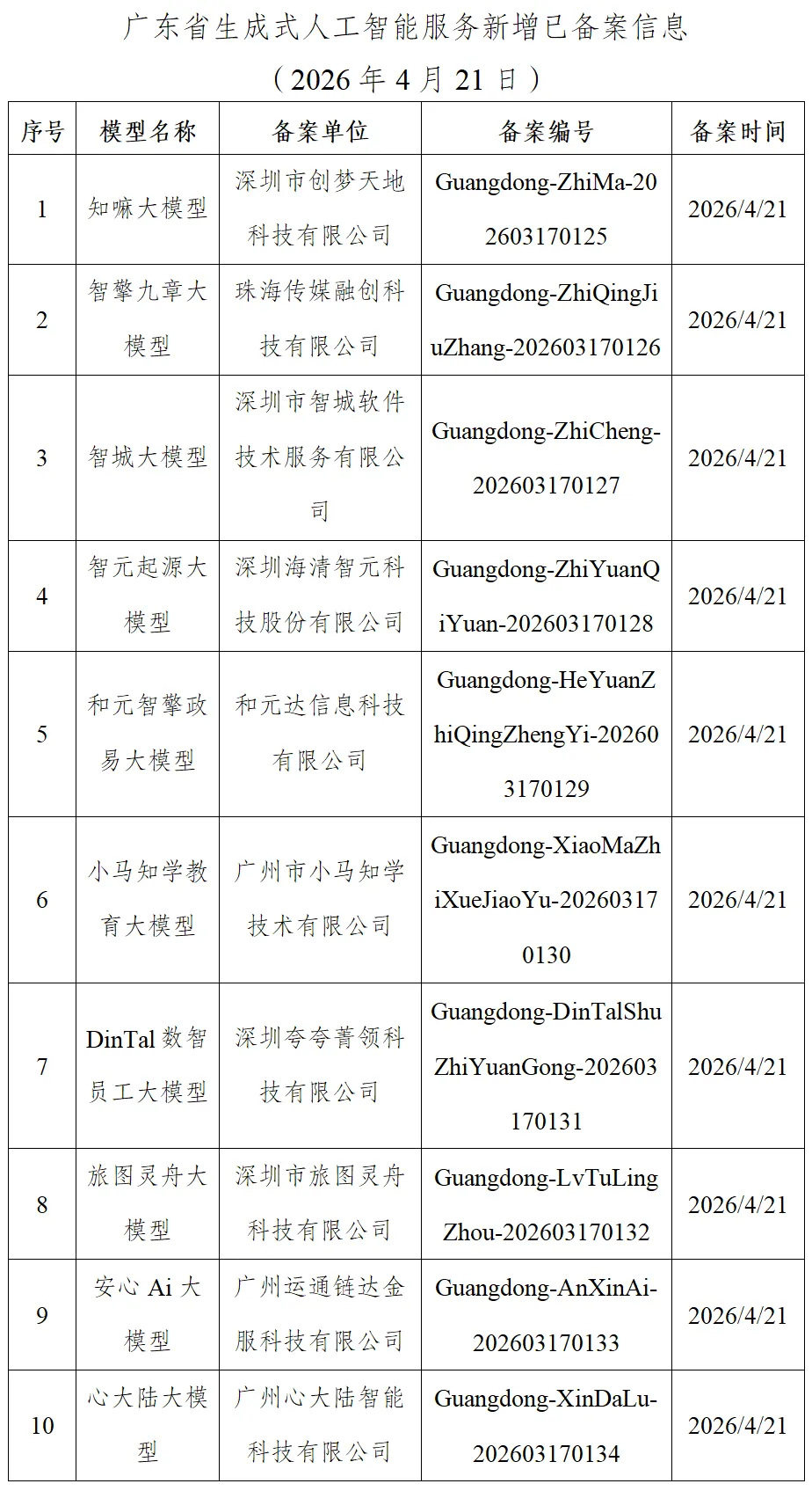 ■ 4月21日,广东省互联网信息办公室发布《广东省生成式人工智能服务已备案信息公告(4月21日)》。据公告,截至4月21日,我省新增10款已完成备案的生成式人工智能服务,累计已完成142款生成式人工智能服务备案。了解更多>>>