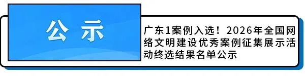 ■ 4月24日,经过初筛、初评、复审、终评等评审环节,2026年全国网络文明建设优秀案例征集展示活动终选结果名单公示,公示时间为4月25日至4月29日。广东省委网信办、广东省文明办申报的“粤港澳大湾区青少年网络素养交流活动”位列其中。了解更多>>>