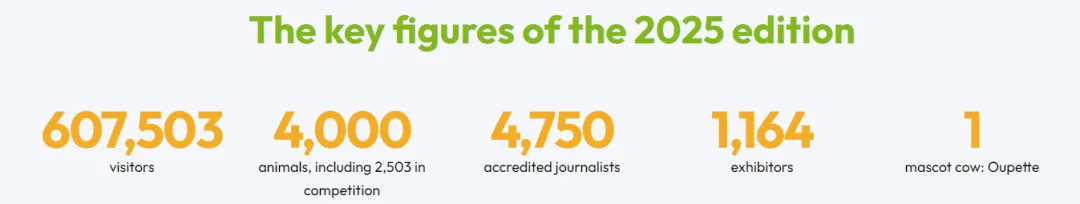 2025年农博会吸引了来自全球22个国家的1164家参展商参展,607503名参观者到场参观,其中包括40000名专业人士和来自法国和国际的采购代表团,4750位媒体记者到场进行报道、国际报道量10645篇次。