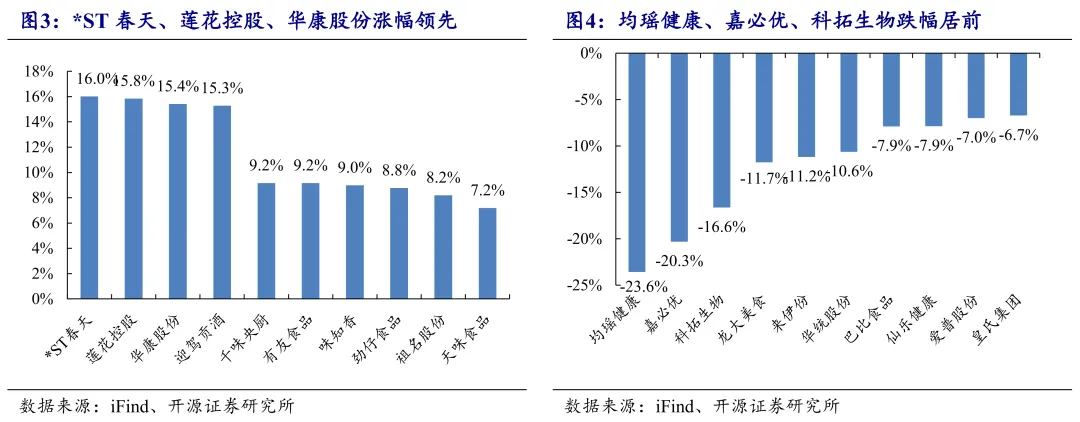 4月20日-4月24日,食品饮料指数涨幅为1.8%,一级子行业排名第4,跑赢沪深300约0.9pct,子行业中预加工食品(+4.4%)、白酒(+2.6%)、调味发酵品(+2.1%)表现相对领先。个股方面,*ST春天、莲花控股、华康股份涨幅领先;均瑶健康、嘉必优、科拓生物跌幅居前。
