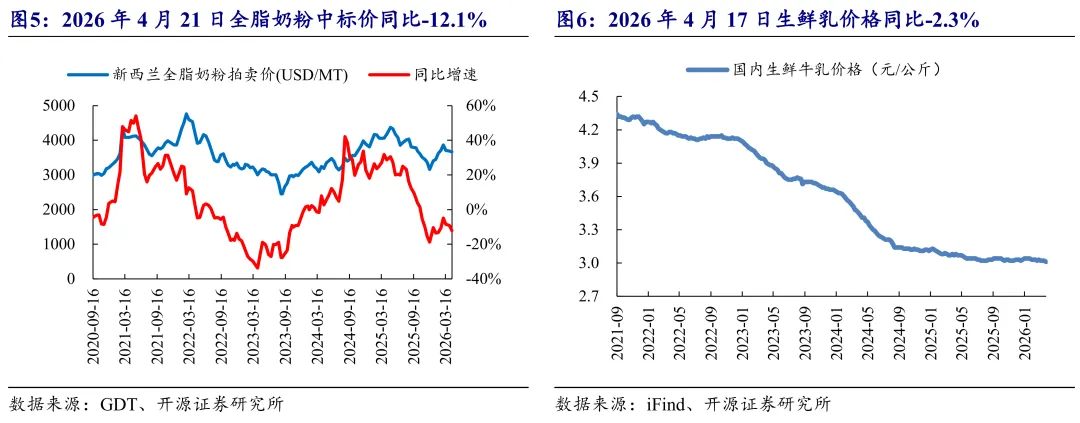 4月21日,GDT拍卖全脂奶粉中标价3666美元/吨,环比-0.6%,同比-12.1%,奶价同比、环比下降。4月17日,国内生鲜乳价格3.01元/公斤,环比持平,同比-2.3%。中短期看国内奶价仍处于回落趋势中。