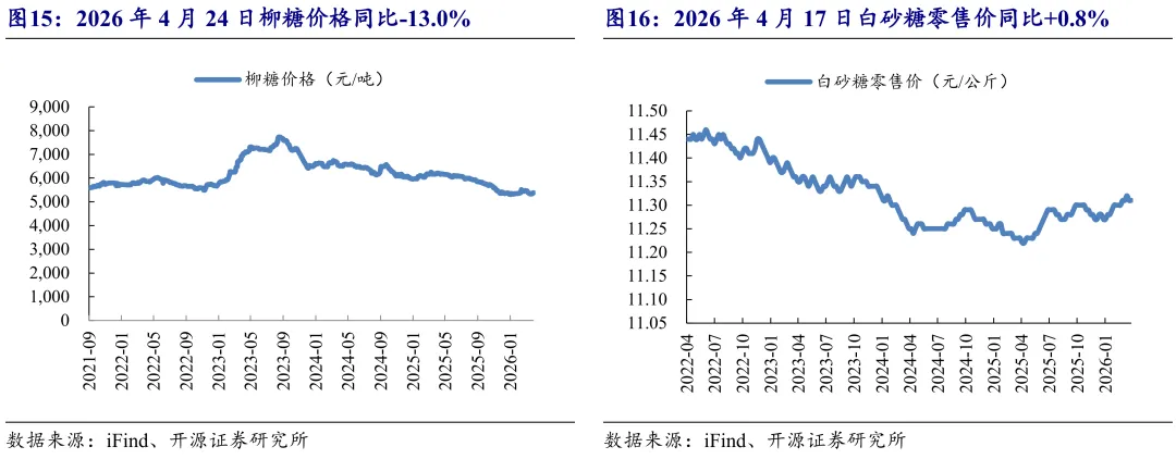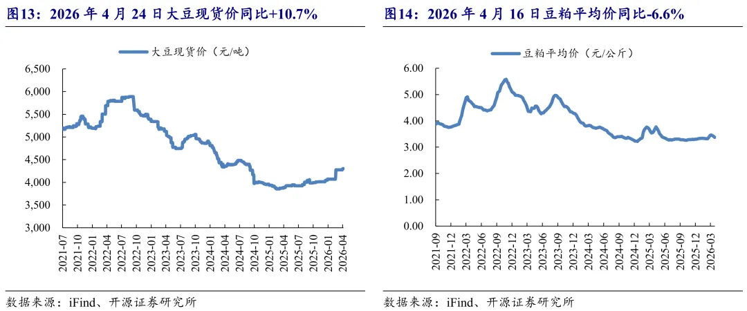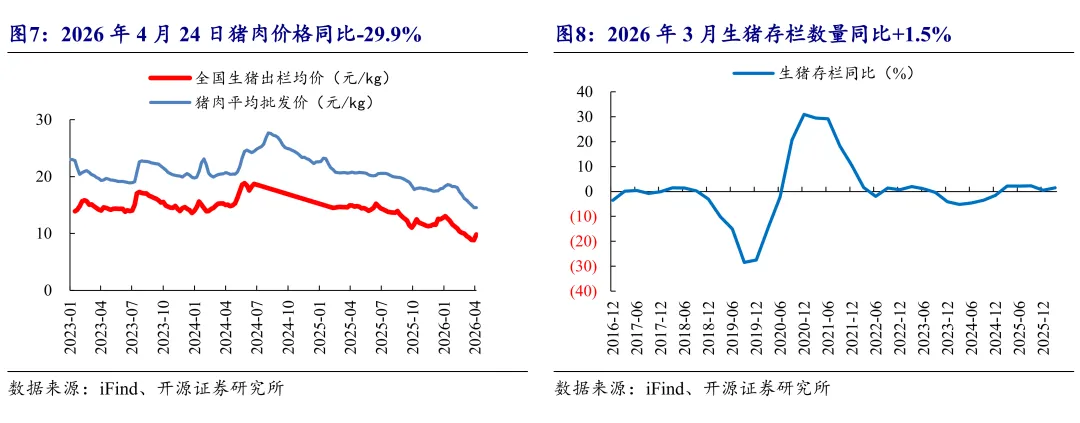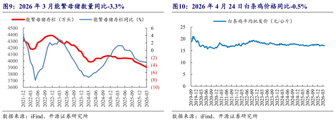 4月24日,生猪出栏价格9.8元/公斤,同比-34.3%,环比+10.8%;猪肉价格14.6元/公斤,同比-29.9%,环比+0.2%。2026年3月,能繁母猪存栏3904.0万头,同比-3.3%,环比-1.4%。2026年3月生猪存栏同比+1.5%,环比-1.4%。2026年4月24日,白条鸡价格17.1元/公斤,同比-0.5%,环比+0.3%。