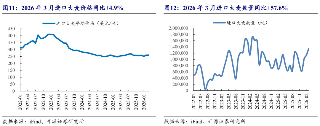 2026年3月,进口大麦价格259.8美元/吨,同比+4.9%。2026年3月进口大麦数量134.0万吨,同比+57.6%,进口大麦数量和平均价格均有所上涨。