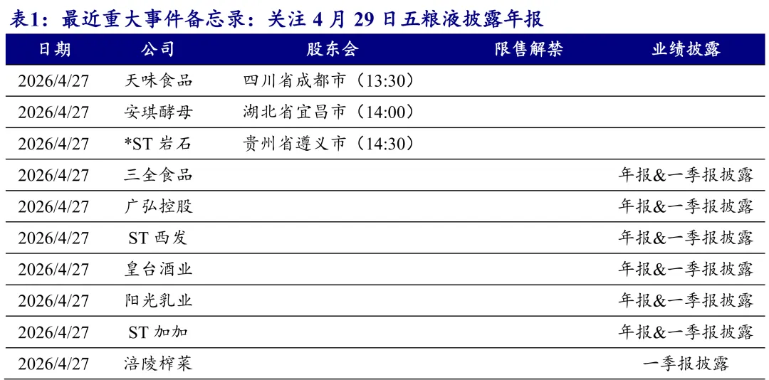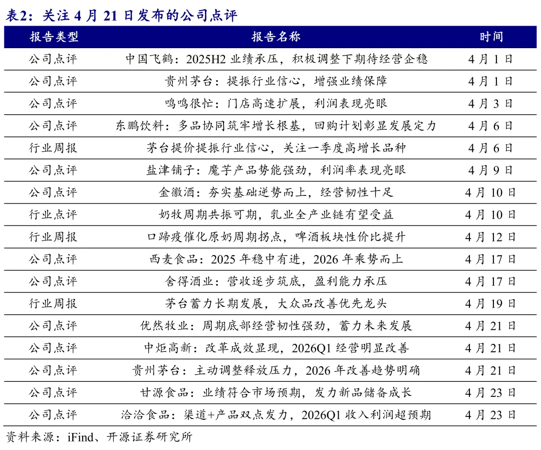 4月20日-4月24日,食品饮料指数涨幅为1.8%,一级子行业排名第4,跑赢沪深300约0.9pct,子行业中预加工食品(+4.4%)、白酒(+2.6%)、调味发酵品(+2.1%)表现相对领先。上市公司一季报已进入密集披露期。从已经公布的情况来看,白酒上市公司2026年一季报呈现两极分化,行业正式进入新一轮周期筑底起点,结构性分化与头部集中成为核心主线。高端白酒龙头贵州茅台实现营收与利润双增,核心受益于市场化改革深化、i 茅台等直营渠道高增及终端动销稳健,批价韧性持续验证品牌壁垒;迎驾贡酒等区域大品酒企业凭借基地市场深耕与大众消费刚需属性,一季度业绩也实现正增长,展现较强抗周期能力。而部分次高端及地产酒,受商务需求疲软、渠道库存高企及价格倒挂影响,一季度业绩同比负增长,行业出清持续深化。当前白酒行业 “哑铃型” 格局,高端与大众价格带表现优于次高端,资源加速向头部集中。展望全年,预计二季度行业报表降幅可进一步收窄,伴随渠道库完成与需求边际改善,低基数背景下,下半年行业有望迎来转正拐点。我们建议坚守确定性主线,建议重点布局品牌壁垒高、渠道掌控力强的高端白酒龙头,以贵州茅台、五粮液为主。