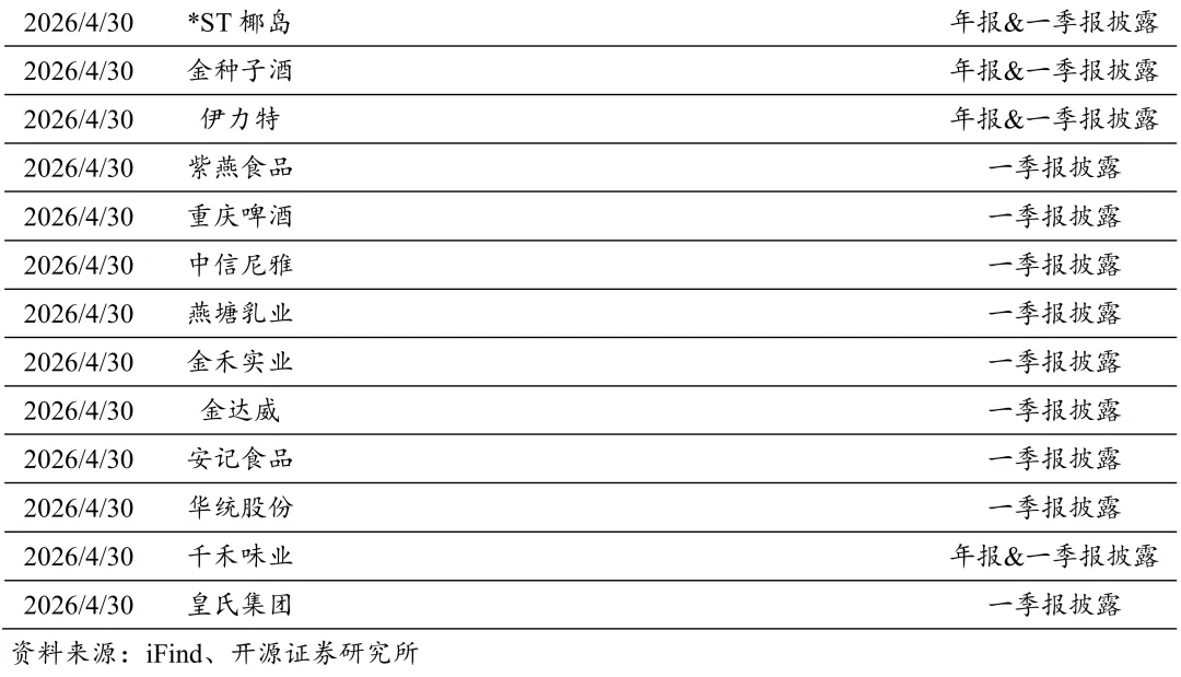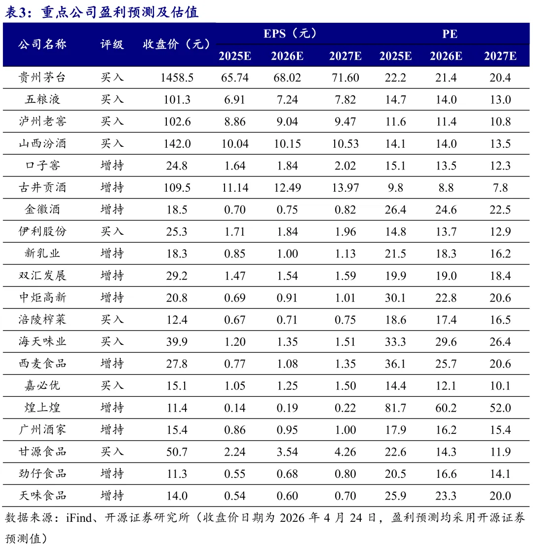 (1)贵州茅台:在白酒需求下移背景下,公司进行市场化改革,以更加务实的姿态,强调未来可持续发展。茅台酒提价后,业绩确定性增强,此轮周期后茅台可看得更为长远。(2)西麦食品:燕麦主业稳健增长,线下基本盘稳固,新渠道开拓快速推进。原材料成本迎来改善,预计营收保持较快增长,盈利能力有望持续提升。(3)海天味业:调味品行业迎来需求复苏,公司品牌渠道优势显著,同时有提价预期,预计中长期收入利润增速向好。(4)甘源食品:看好公司困境反转机会,展望2026年公司经过调整后目前各渠道趋势向好,2025H1低基数叠加2026年春节时间错配,我们预计2026Q1报表业绩可能有较大弹性。