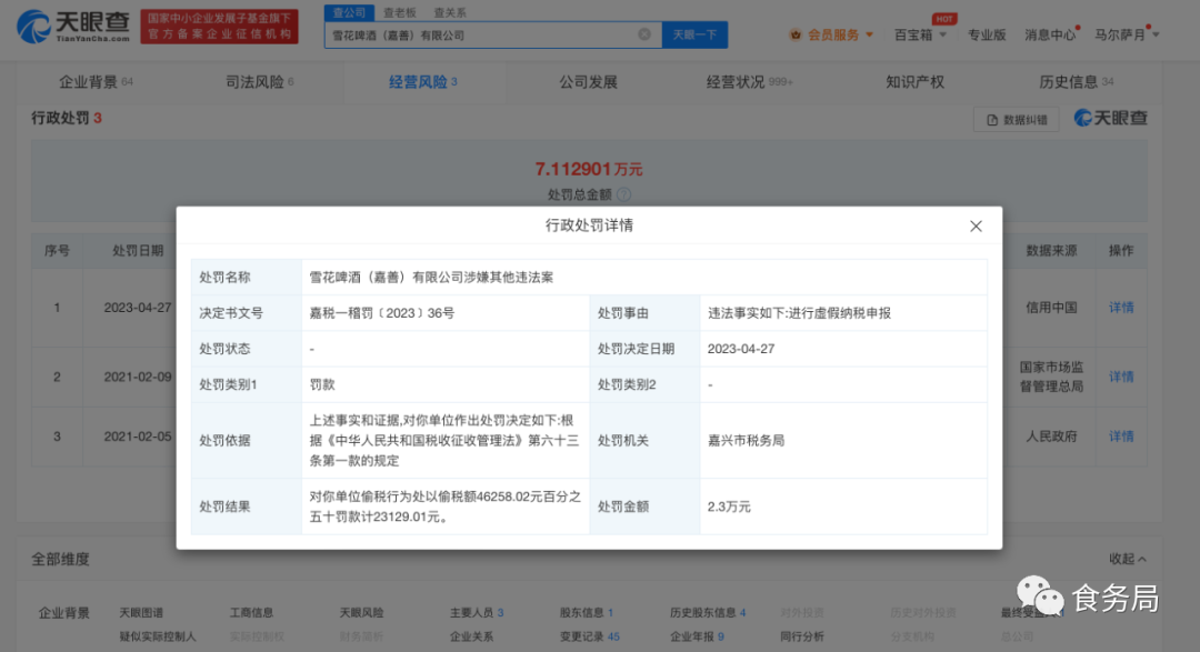 近日,雪花啤酒(嘉善)有限公司因进行虚假纳税申报,被嘉兴市税务局处以偷税额4.62万余元百分之五十罚款计2.31万余元。