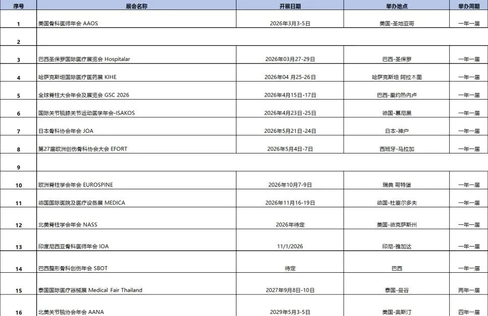 2026年全球骨科医疗展览计划表
