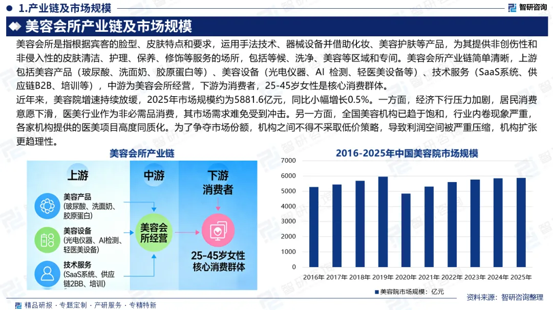 产业链:美容会所产业链简单清晰,上游包括美容产品(玻尿酸、洗面奶、胶原蛋白等)、美容设备(光电仪器、AI 检测、轻医美设备等)、技术服务(SaaS系统、供应链B2B、培训等),中游为美容会所经营,下游为消费者,25-45岁女性是核心消费群体。