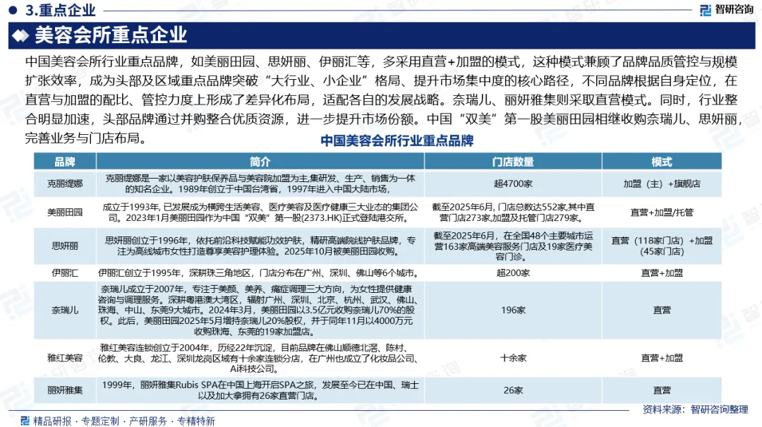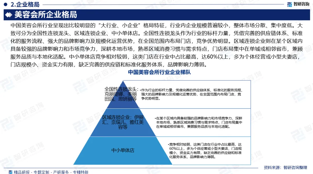 美容会所是指根据宾客的脸型、皮肤特点和要求,运用手法技术、器械设备并借助化妆、美容护肤等产品,为其提供非创伤性和非侵入性的皮肤清洁、护理、保养、修饰等服务的场所,包括等候、洗净、美容等区域和专间。近年来,美容院增速持续放缓,2025年市场规模约为5881.6亿元,同比小幅增长0.5%。一方面,经济下行压力加剧,居民消费意愿下滑,医美行业作为非必需品消费,其市场需求难免受到冲击。另一方面,全国美容机构已趋于饱和,行业内卷现象严重,各家机构提供的医美项目高度同质化。为了争夺市场份额,机构之间不得不采取低价策略,导致利润空间被严重压缩,机构扩张更趋理性。中国美容会所行业呈现出明显的“大行业、小企业”格局特征,行业内企业规模普遍较小,整体市场分散、集中度低。大致可分为全国性连锁龙头、区域连锁企业、中小单体店。