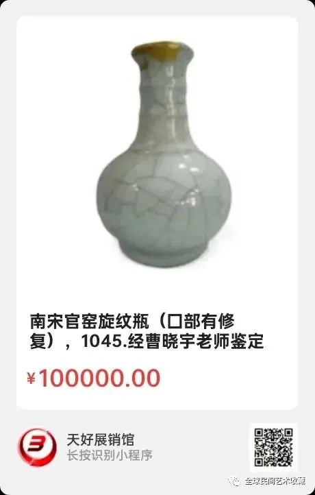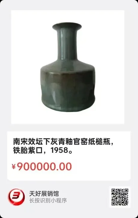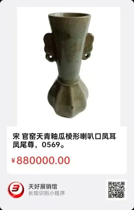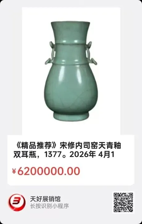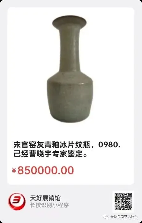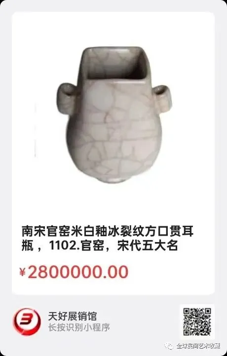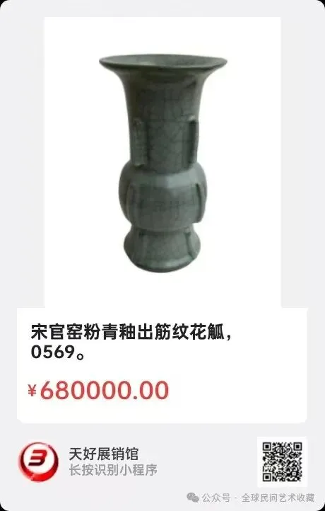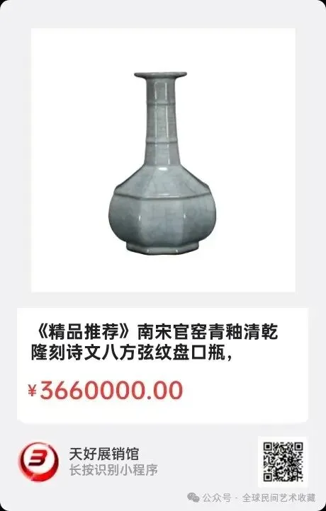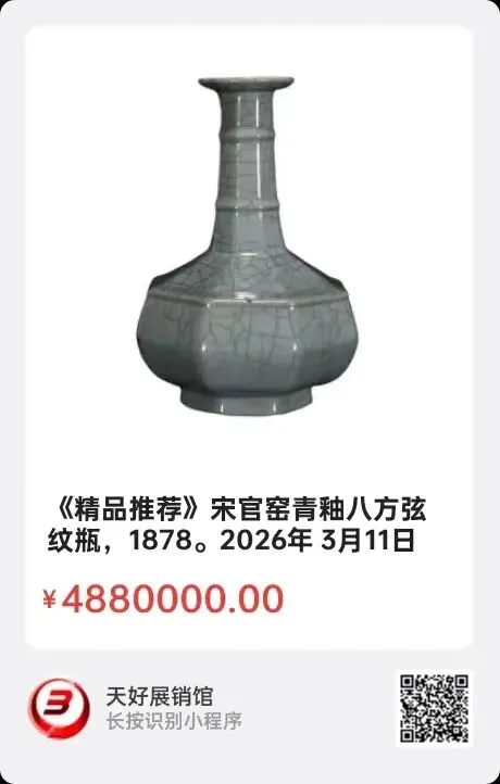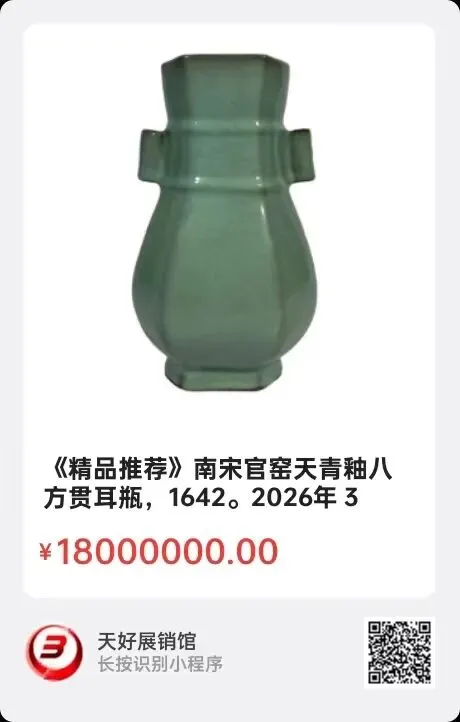 南宋官窑天青釉八方贯耳瓶,藏品尺寸:高23cm 宽13cm,这件南宋官窑天青釉八方贯耳瓶,是南宋官窑的经典器型。它的造型瓶身呈八方形,颈部两侧有对称的管状贯耳,颈部有弦纹,腹部饱满,下承八方圈足,整体造型仿自上古青铜礼器。其通体施天青釉,釉面肥厚温润,布满自然开片,是官窑瓷器的标志性特征。底心有方形篆书“官”字款,这是宋代官窑(尤其是北宋及南宋修内司官窑)的典型款识,表明其为宫廷御制。从器型、釉色、开片及“官”字款综合判断,这件器物就是南宋官窑真品。南宋官窑(修内司、郊坛下)是宋代五大名窑之一,专为宫廷烧造,存世稀少,价值极高。2026年 3月18日,经天好评审团评审,以8票优势荣登精品榜,获第202期天好海选精品。来源1642.V。