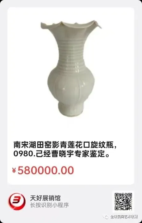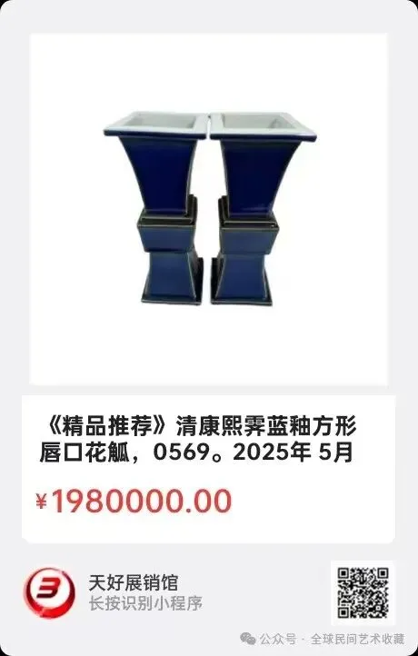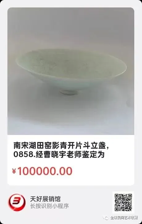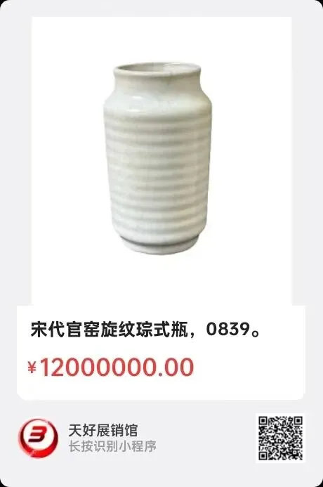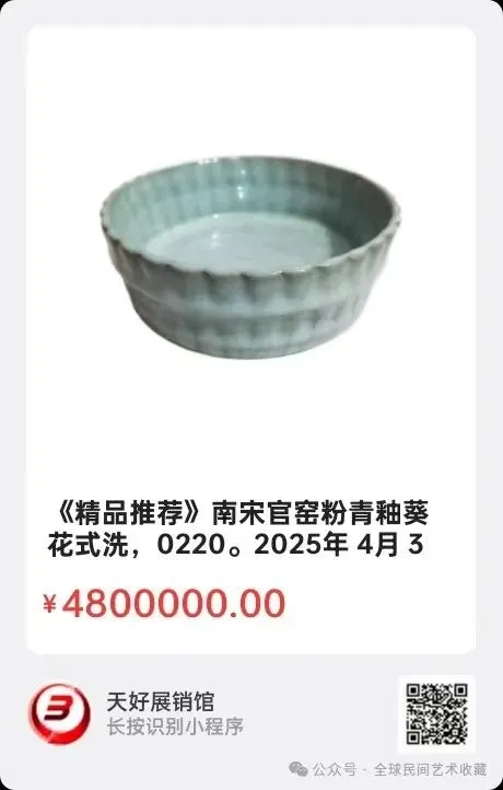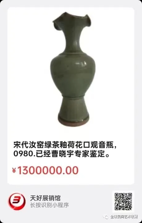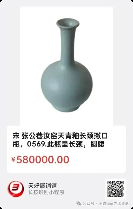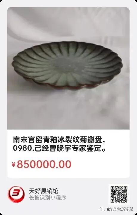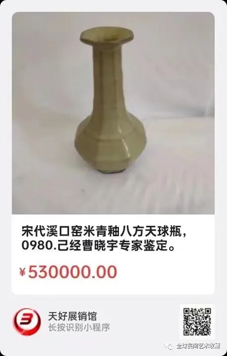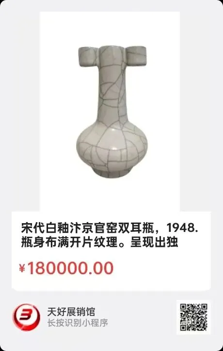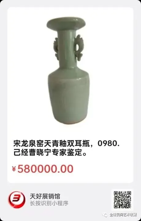 南宋官窑天青釉八方贯耳瓶,藏品尺寸:高23cm 宽13cm,这件南宋官窑天青釉八方贯耳瓶,是南宋官窑的经典器型。它的造型瓶身呈八方形,颈部两侧有对称的管状贯耳,颈部有弦纹,腹部饱满,下承八方圈足,整体造型仿自上古青铜礼器。其通体施天青釉,釉面肥厚温润,布满自然开片,是官窑瓷器的标志性特征。底心有方形篆书“官”字款,这是宋代官窑(尤其是北宋及南宋修内司官窑)的典型款识,表明其为宫廷御制。从器型、釉色、开片及“官”字款综合判断,这件器物就是南宋官窑真品。南宋官窑(修内司、郊坛下)是宋代五大名窑之一,专为宫廷烧造,存世稀少,价值极高。2026年 3月18日,经天好评审团评审,以8票优势荣登精品榜,获第202期天好海选精品。来源1642.V。