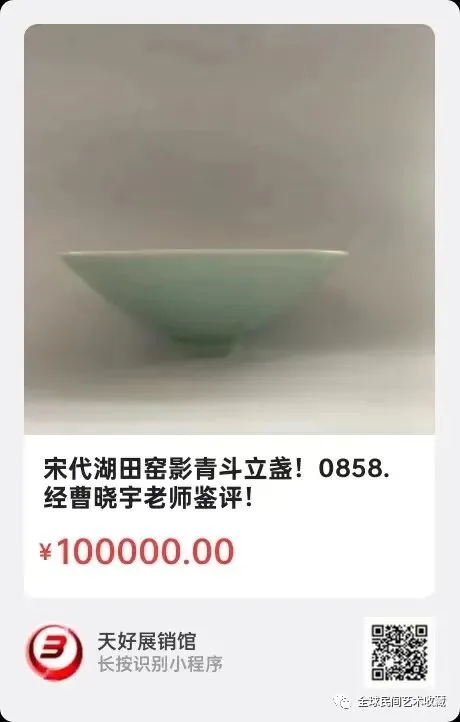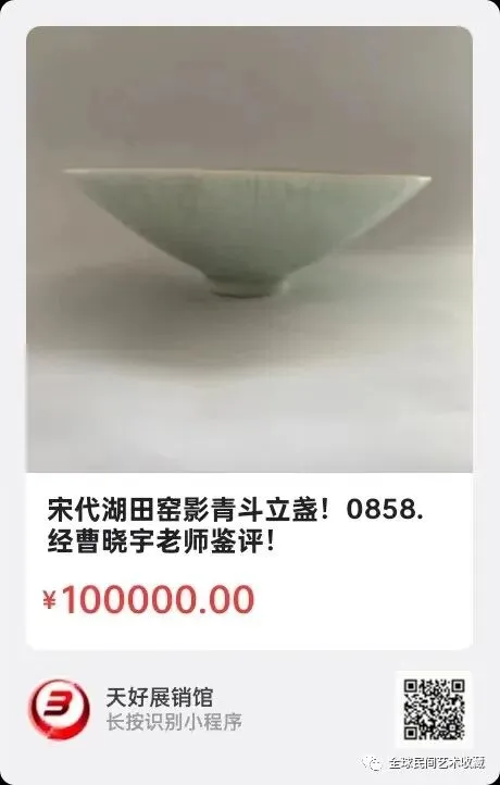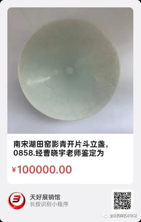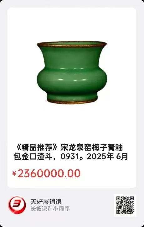 宋龙泉窑梅子青釉包金口渣斗,规格:高10.7cm,口径12.5厘米。2025年 6月 25日,经天好评审团评审,以6票优势荣登精品榜,获第176期天好海选精品。来源0931.V.